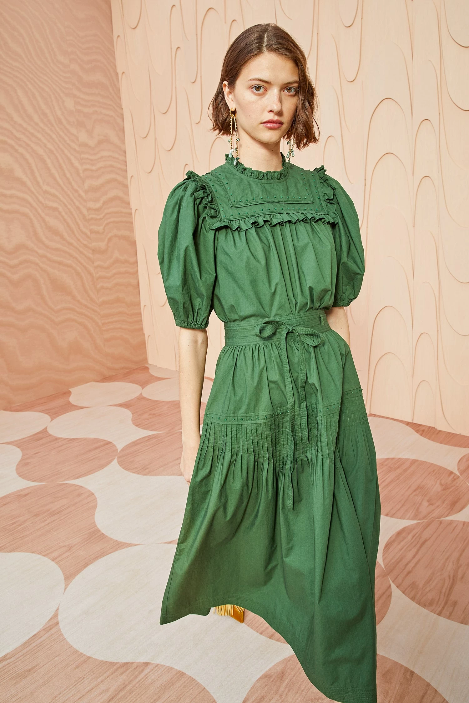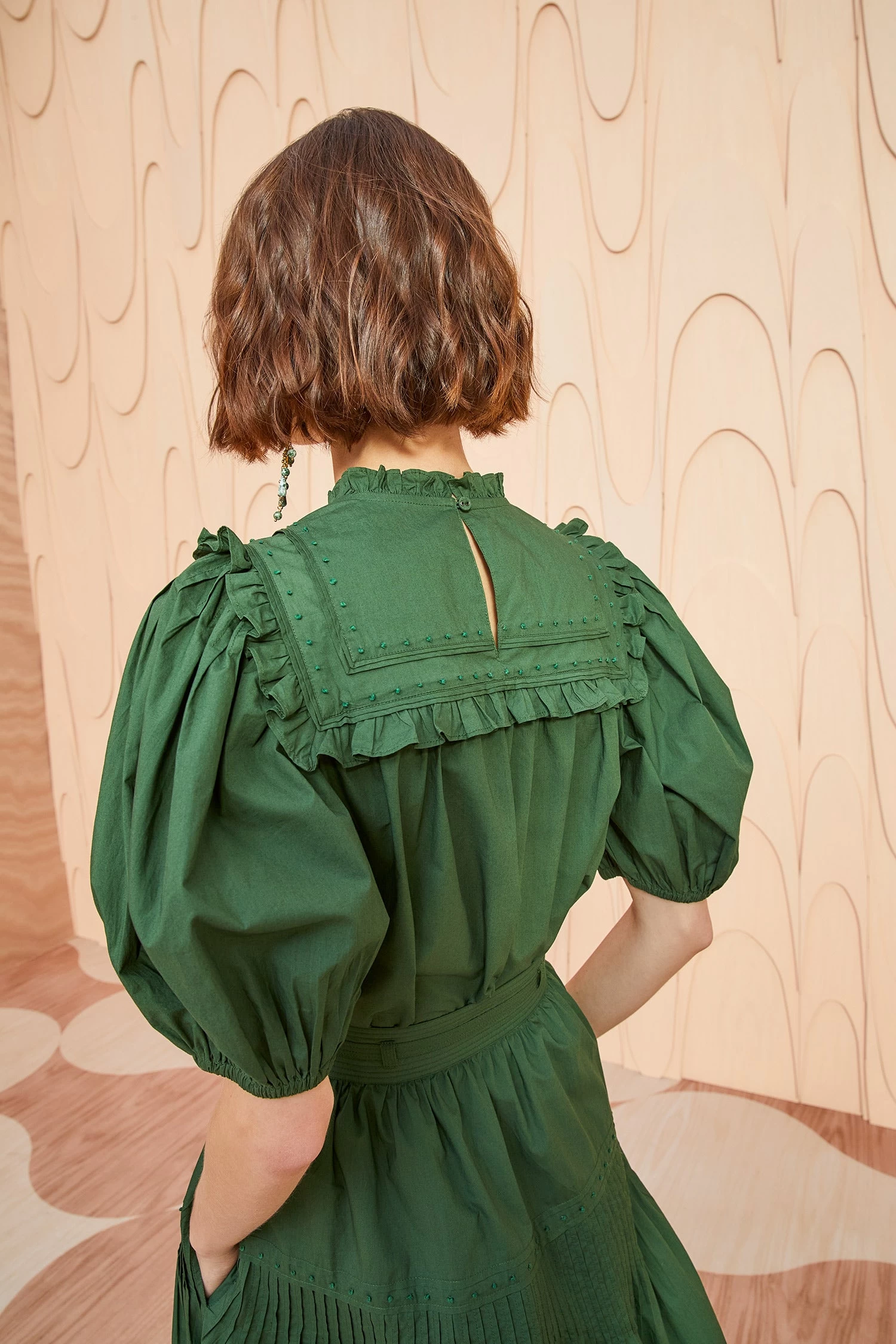 The Adeline Top is made from our signature water washed poplin in a gorgeous shade of juniper green. This short-sleeve top is beautifully detailed with ruffles and French knots embroidered by hand. It is finished with a buttoned keyhole at the back. Wear yours with our Blythe Skirt to get the full look.