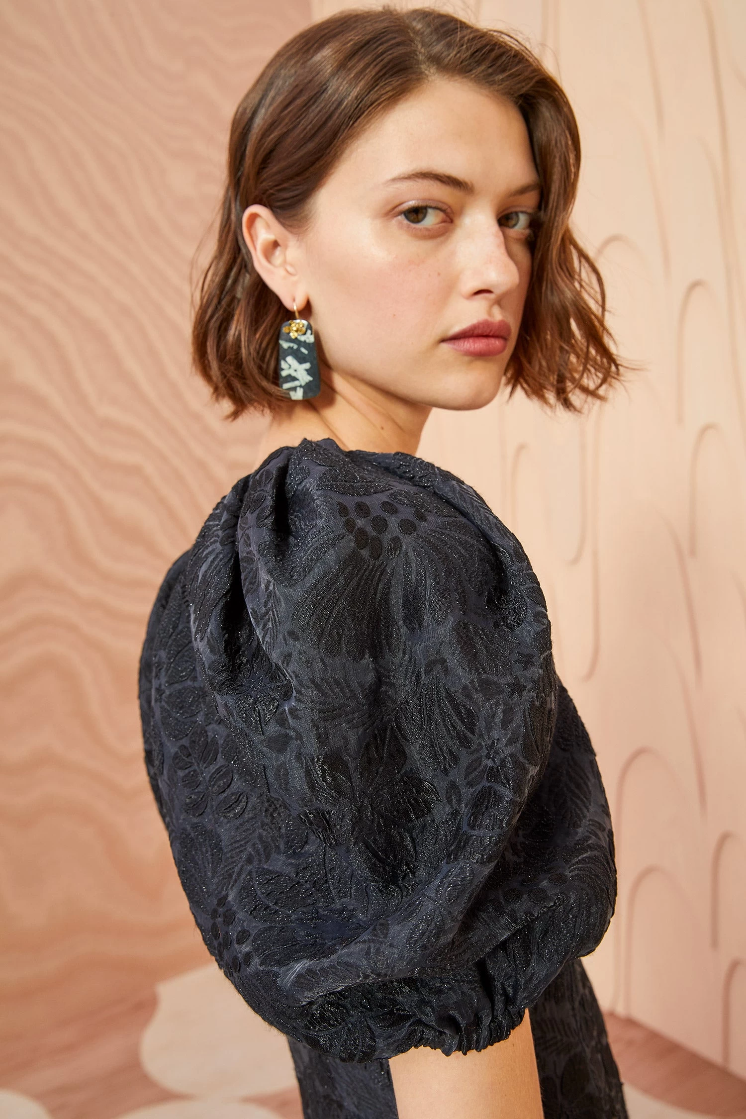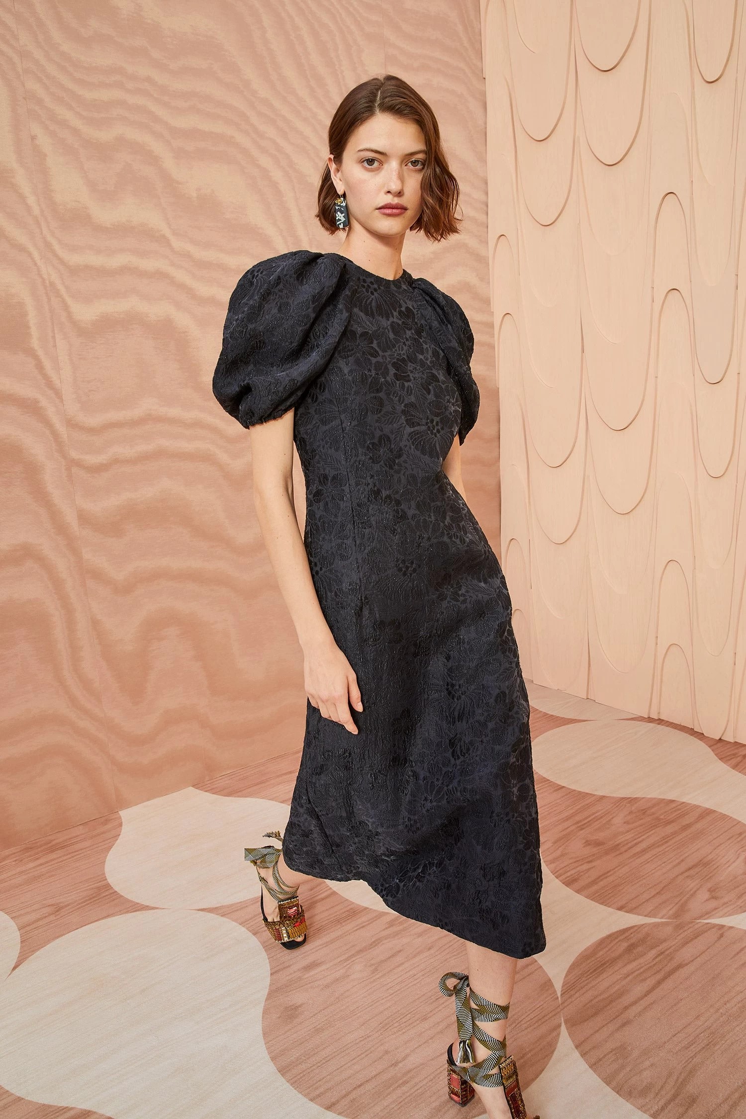 Crafted from our standout cloqué jacquard, the Amandine Dress features a gorgeous moon flower motif and is the perfect style for a special occasion. This timeless black midi dress features our signature puff sleeves, a body-skimming silhouette, and a back hem split for ease of movement. It is finished with a hidden center-back zipper.