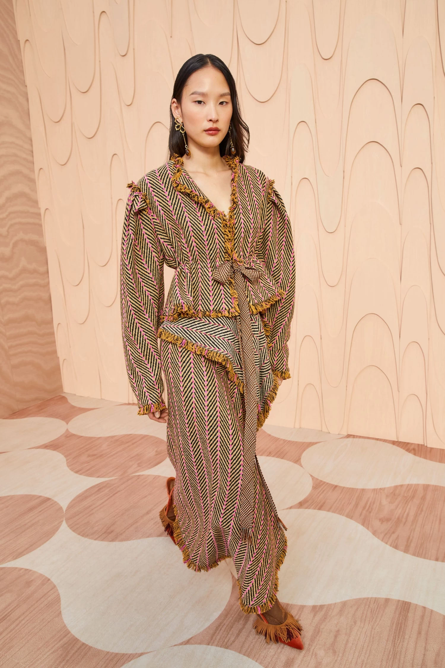 As featured in Look 25 of our Autumn/Winter ’23 Runway Show, the Ames Jacket is cut from Italian herringbone tweed coating in a peplum-style silhouette. Designed with a simple collarless neckline, this cropped jacket features playful fringe along the seams and is finished with a woven ribbon tie at the waist.