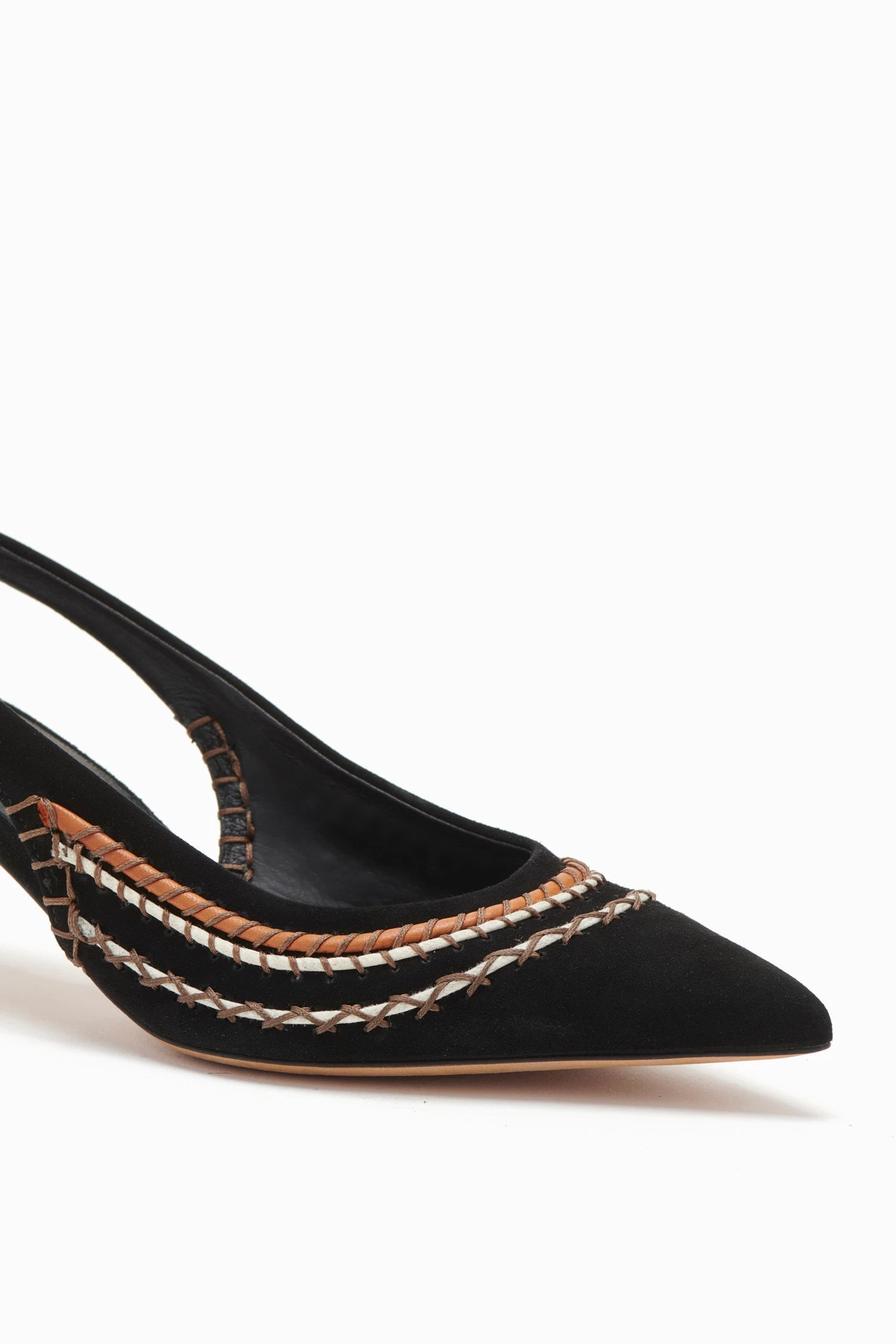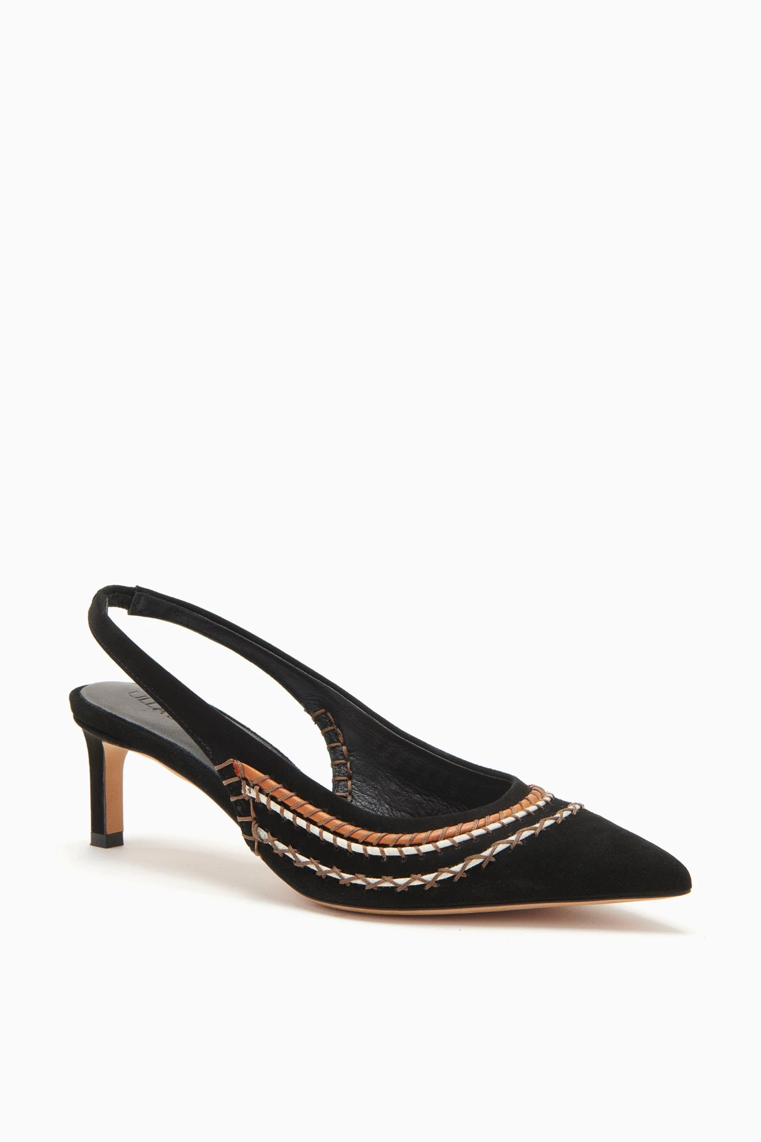 The Antonia Sling Back is made from classic black leather and features our newest kitten heel shape. They are embellished with beautiful cotton stitching and wax cording around the top opening.