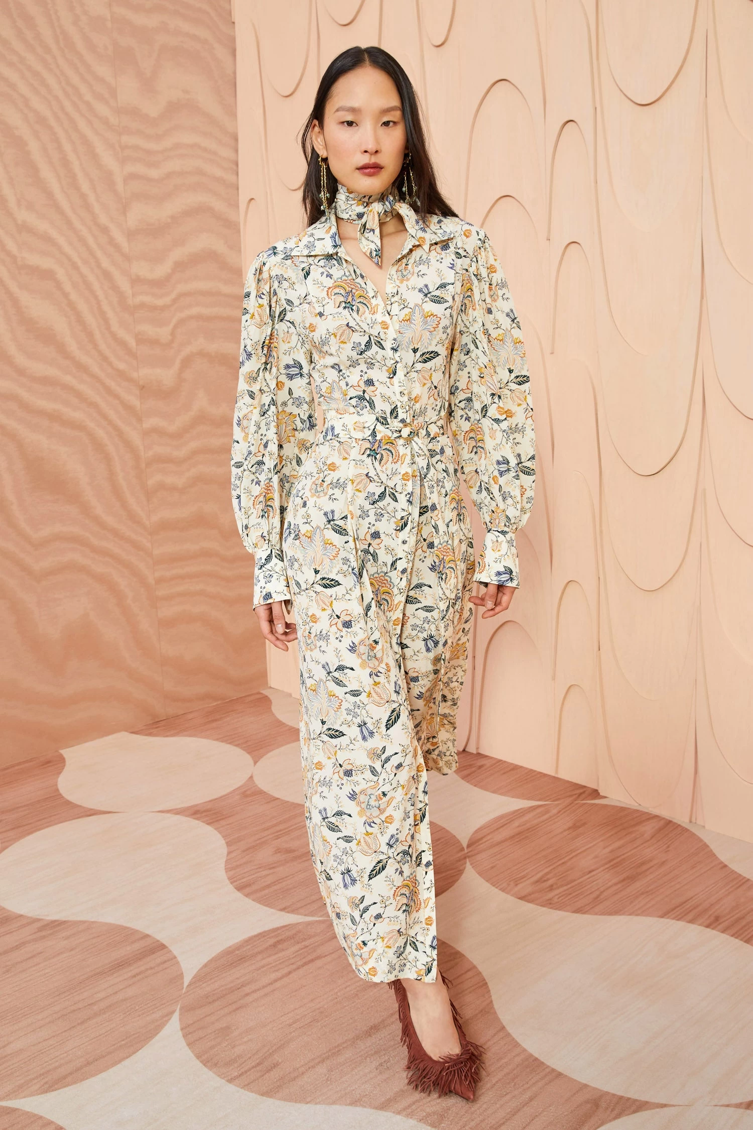 The Athena Dress is a gorgeous, timeless shirt silhouette crafted from our orange blossom printed silk crepe de chine–the charming florals are inspired by vintage French botanicals that were collaged and then redrawn to create intricate trailing vines. This cream-based maxi dress is defined by voluminous long sleeves and hammered brass hardware at the optional belt. It is finished with a center-front button closure.