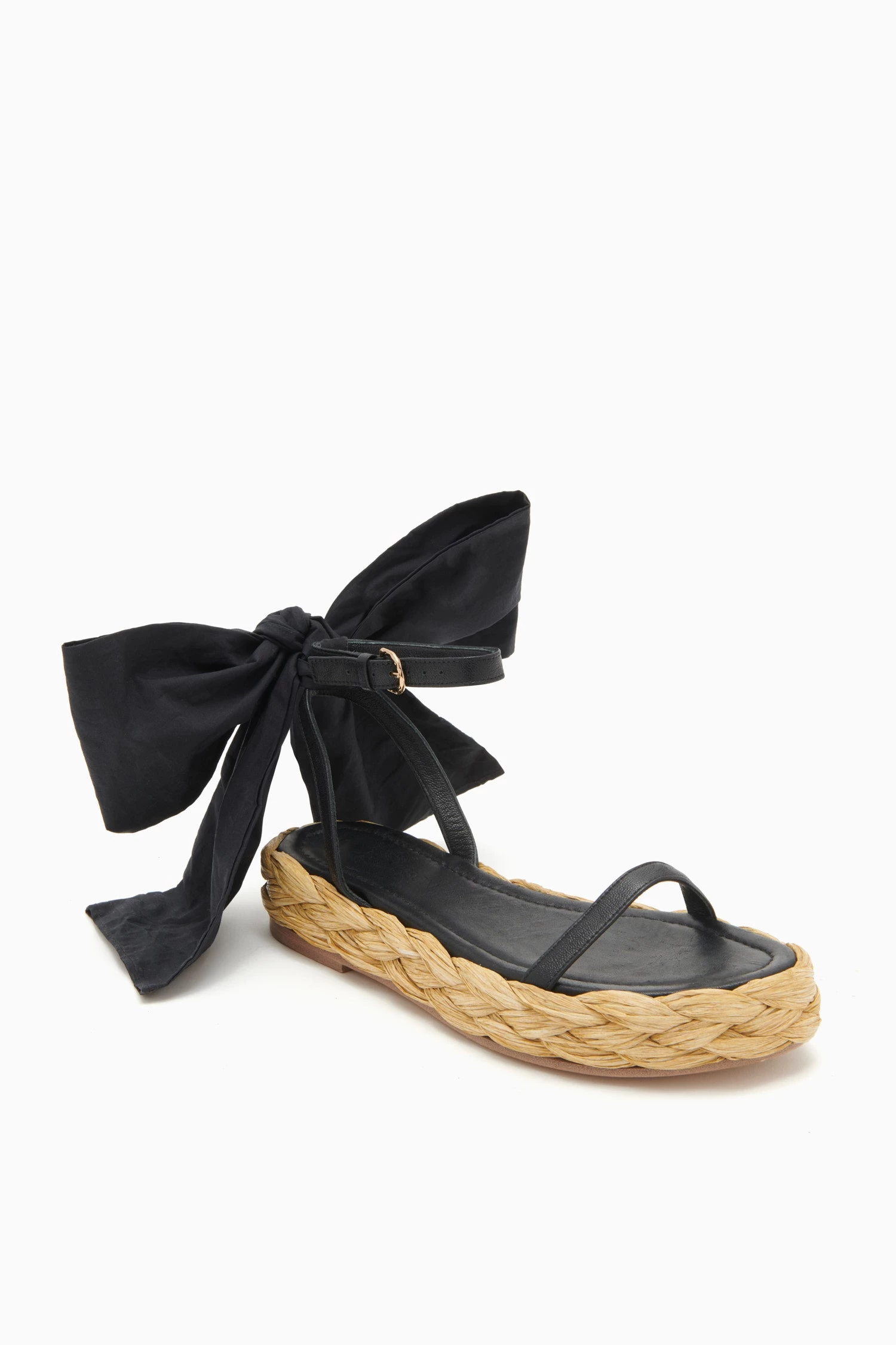 The Clara Bow Flatform is crafted from black leather and sits on a raffia base. This elegant sandal is defined by a dramatic black cotton poplin bow, which is fastened at its center and will remain securely in place while being worn. The bow is designed to sit at the back of the ankle, but it can also be positioned anywhere along the ankle strap, or removed entirely to achieve a more minimalist look.