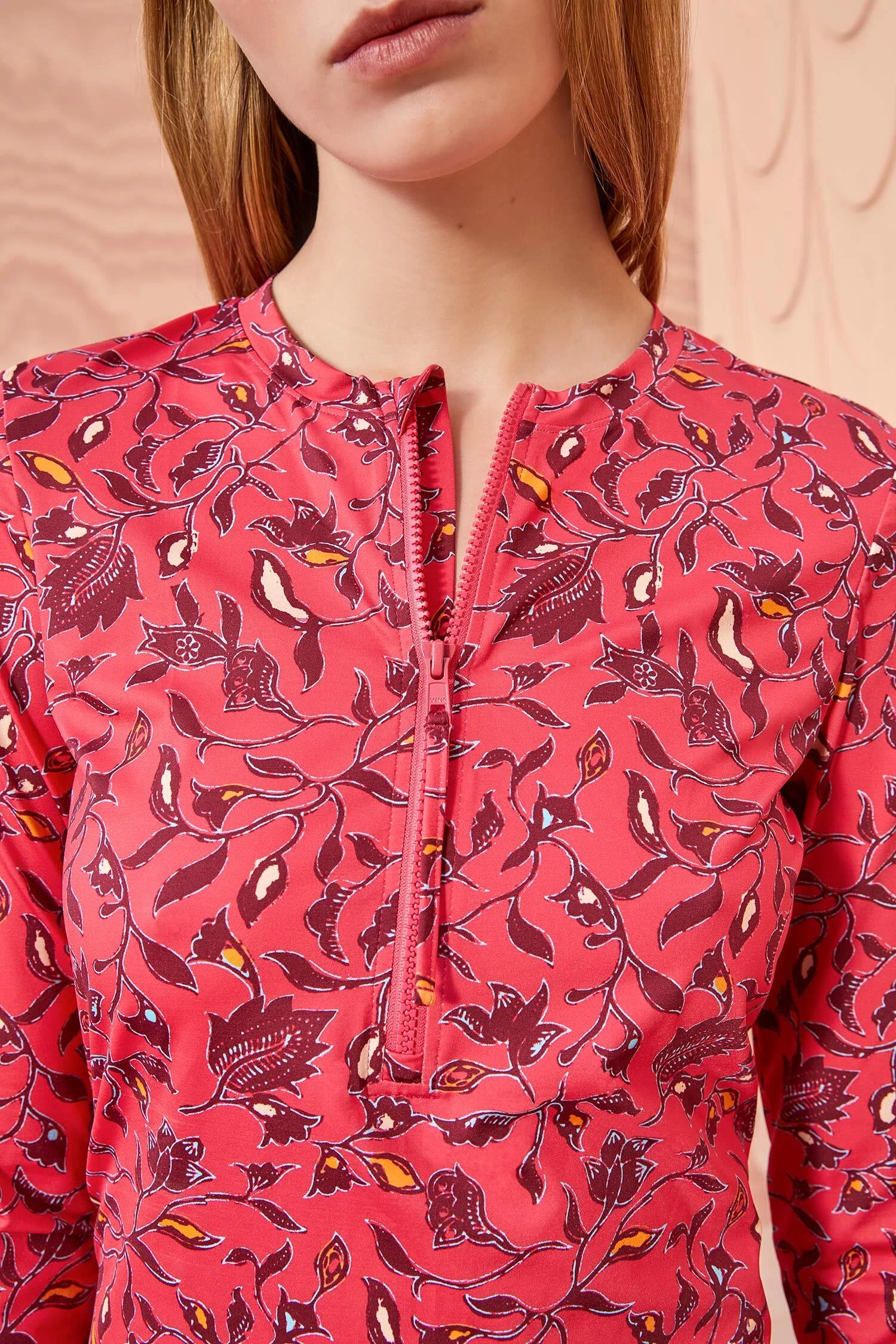 An Ulla Johnson exclusive only available in our stores or on our website, the Dione Rash Guard is crafted from comfortable, stretchy nylon that boasts a floral dark pink geometric print. This long-sleeved, full-coverage swim silhouette is a pull-over style and features a classic round collar. This showstopping gown is an Ulla Johnson exclusive and is only available in our stores or on our website.