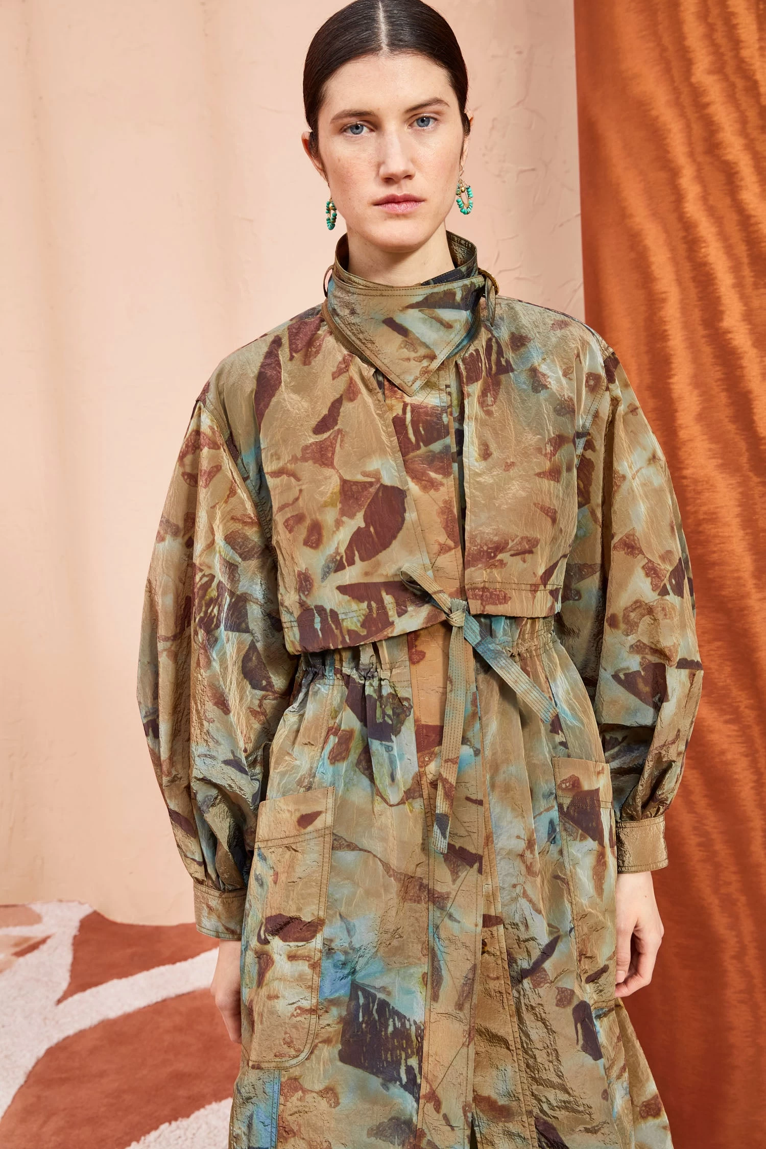 As featured in Look 9 of our Pre-Fall ’23 Lookbook, the Elettra Trench is made from a water-repellent fabric that has been intricately crafted in Italy through a meticulous hand-dyeing process, resulting in unique variations of light blue and brown hues. No two pieces are alike. This floor-length overcoat features long billowing sleeves, a fitted bodice with drawstring ties, exaggerated pockets, and a handkerchief neckline. Finished with hammered brass loops.
