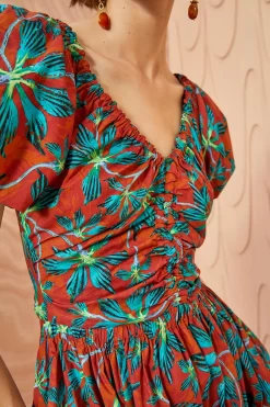An Ulla Johnson exclusive only available in our stores or on our website, the Ema Scarf is an ascot style made from 100% silk expertly hand-dyed with a geometric pattern by women artisans in Bangalore. This rich brown and bright emerald beauty can be tied elegantly around the neck, threaded through your hair, or as an adornment to a favorite handbag.