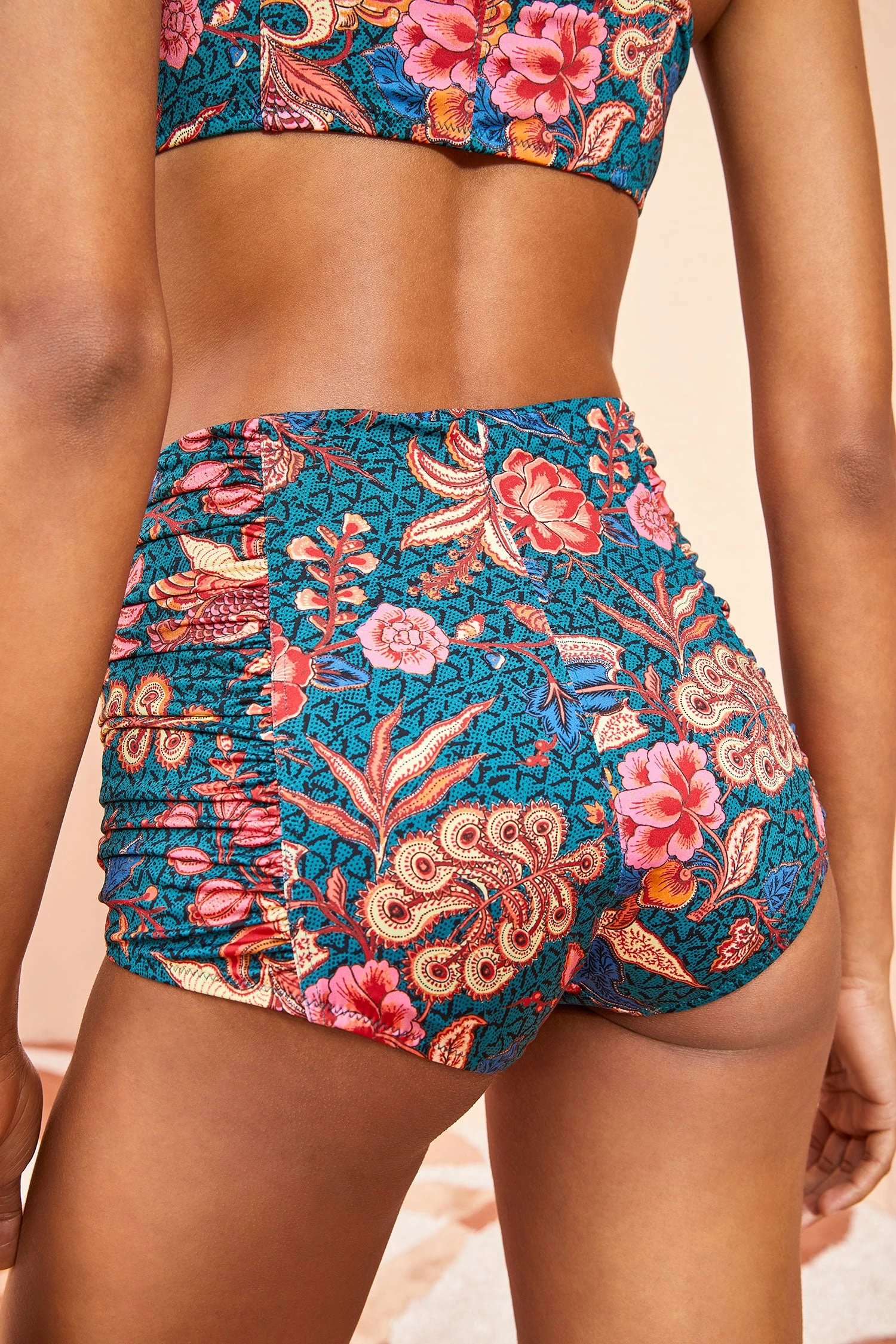 The Finn Bikini Bottom is a high-rise silhouette crafted in our teal, yellow and pink batik floral print. Defined by ruched panels along the sides, this full-coverage bottom pairs perfectly with our Deia top in Delphinium.