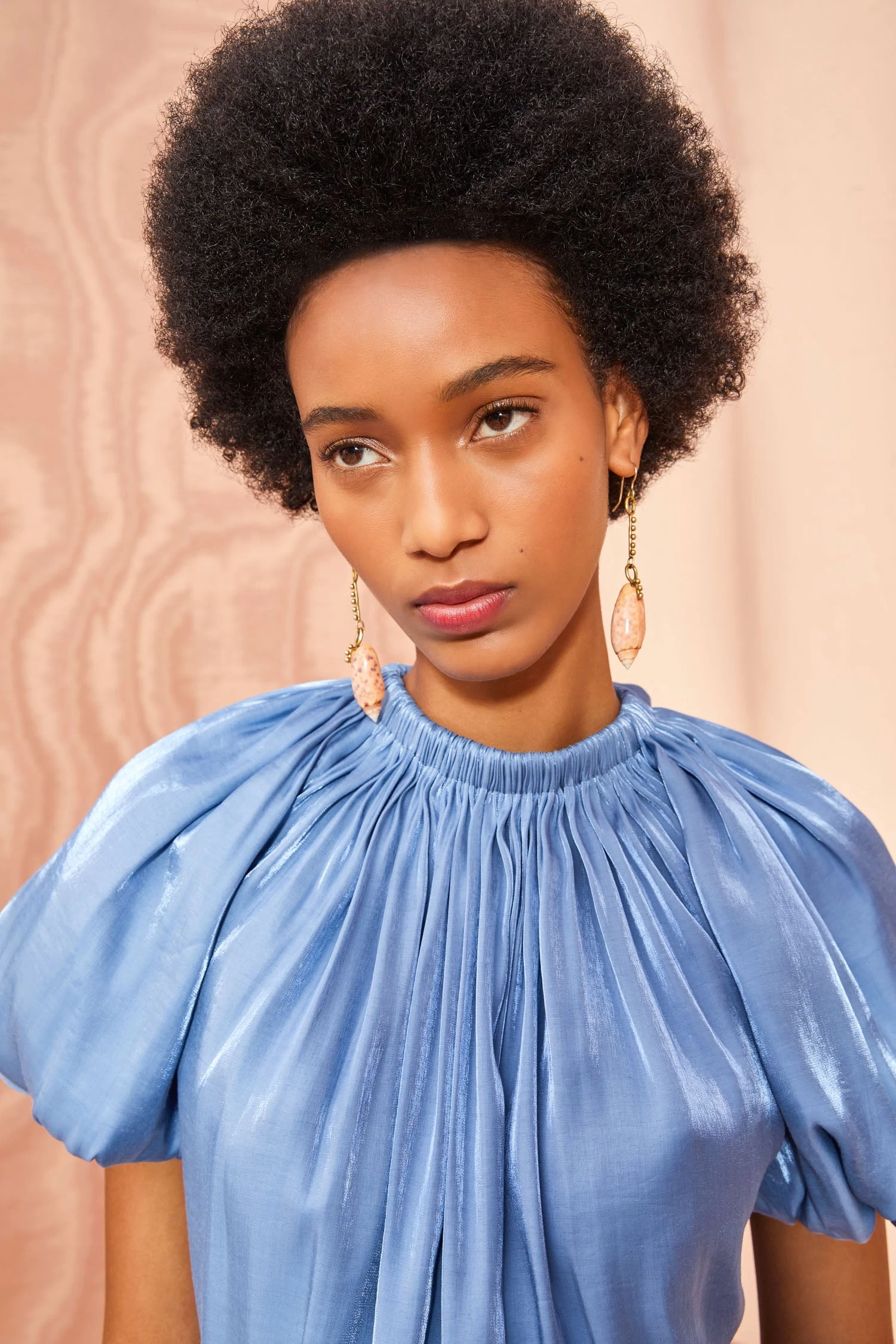 The Flo Top is crafted from iridescent Italian satin in a light blue hue. This luxurious blouse features short puff sleeves, an elastic high neckline and a circular open back detail that finishes with a ribbon tie closure.