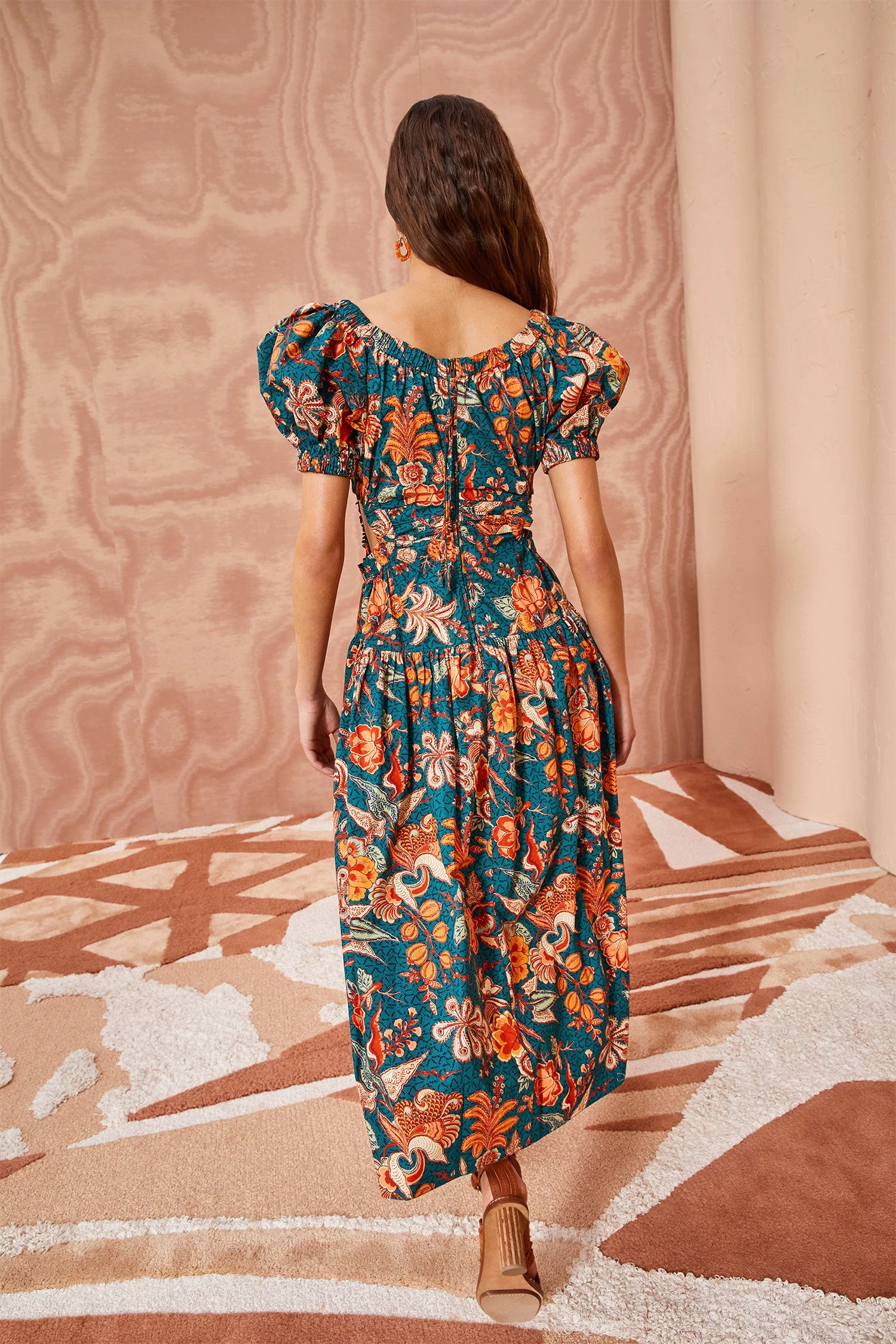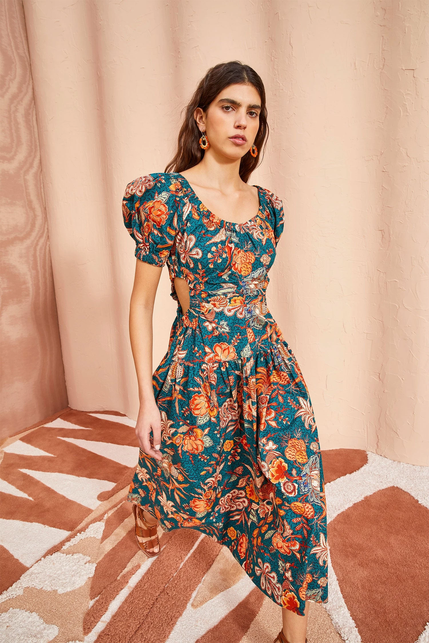 The Golda Dress is crafted from our wild hibiscus-printed poplin, featuring a bold floral design in turquoise, coral, and peach. This midi dress has short puff sleeves and is defined by its round collar and circular cut-outs at the fitted waist. This lightweight beauty is finished with a full skirt, pockets and a long back zipper pull for self-closure.