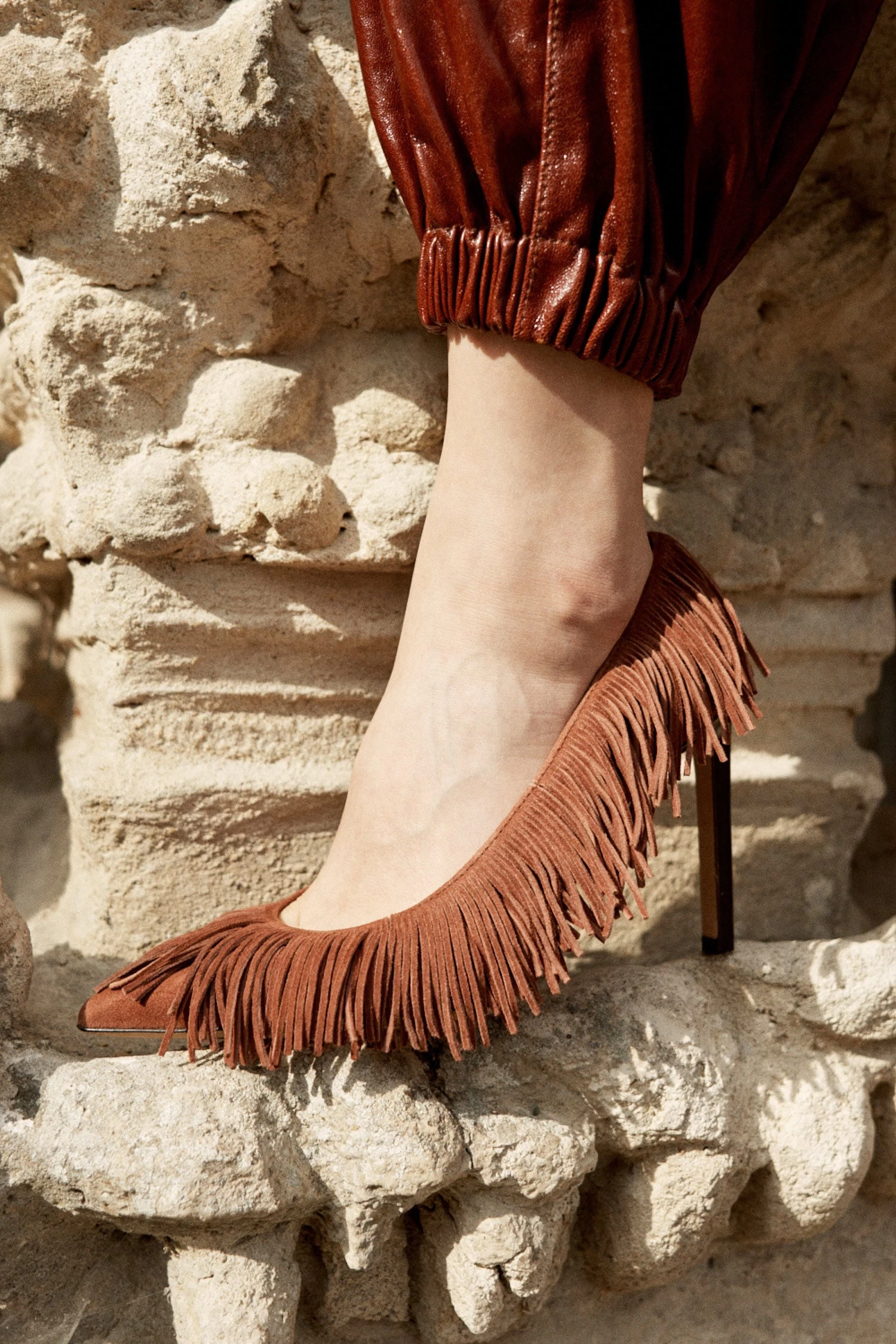 As featured in Look 38 and 50 of our Autumn/Winter ’23 Runway Show, the Inez Fringe High Heel is designed with our new straight heel shape that is 95mm tall. This lovely red auburn shoe is wearable while maintaining intrigue with fine suede fringe along the topline of the shoe opening.