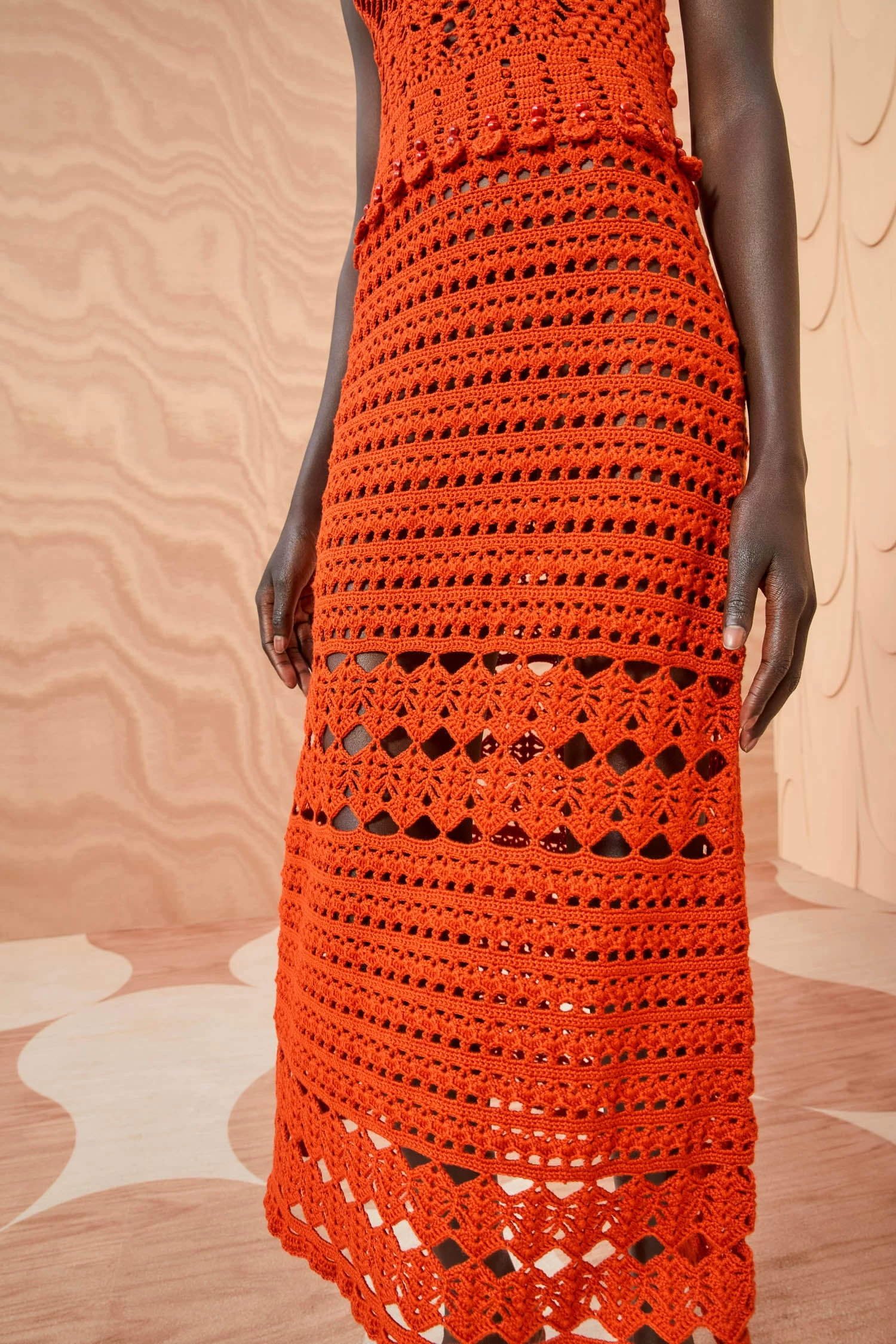 As featured in Look 10 of our Autumn/Winter ’23 Lookbook, the Innika Dress is made from Italian-spun merino wool that is hand-crocheted into lattice-like stitches, alternating patterns along its length. This sleeveless column dress is a gorgeous earthy orange and is adorned with small wooden beads.