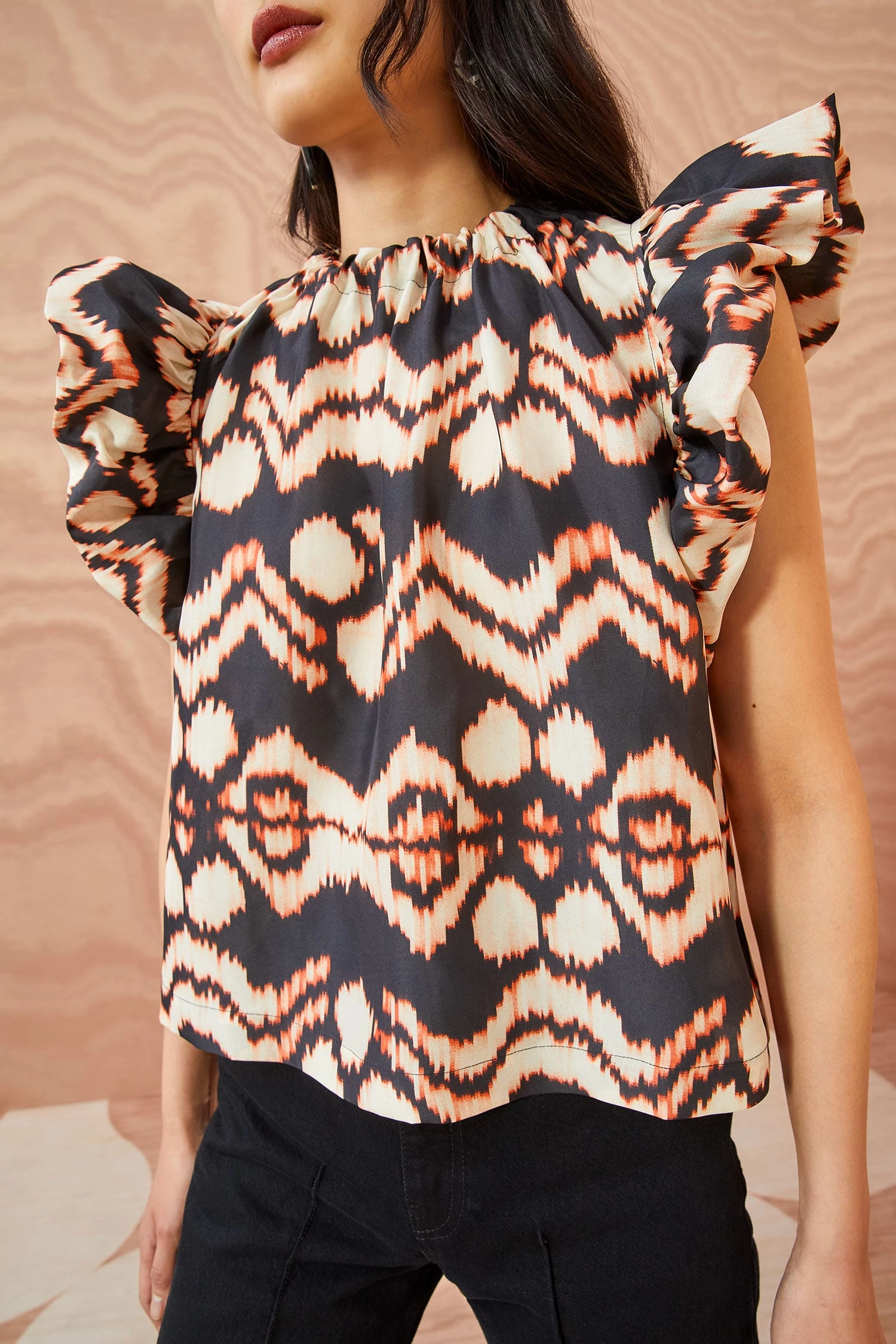 A standout print from our Autumn/Winter ’23 collection, the Iren Top is saturated in our painted ikat motif with cream graphics against a black backdrop. It is framed by voluminous flutter sleeves, has a loose silhouette, and a tie-fastening keyhole at the back. Wear yours with one of our handmade denim styles.