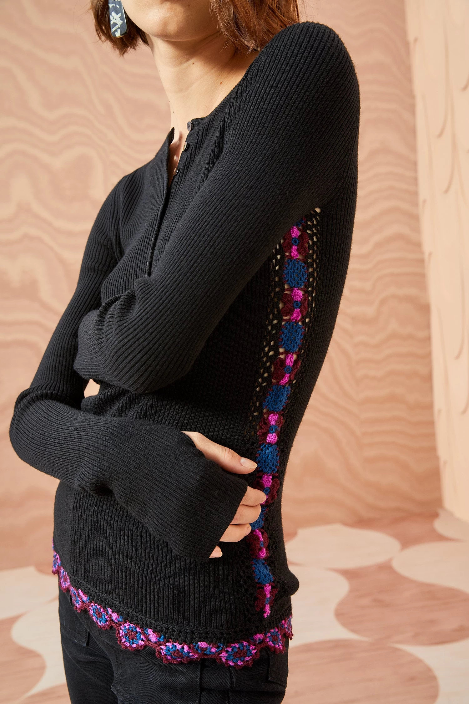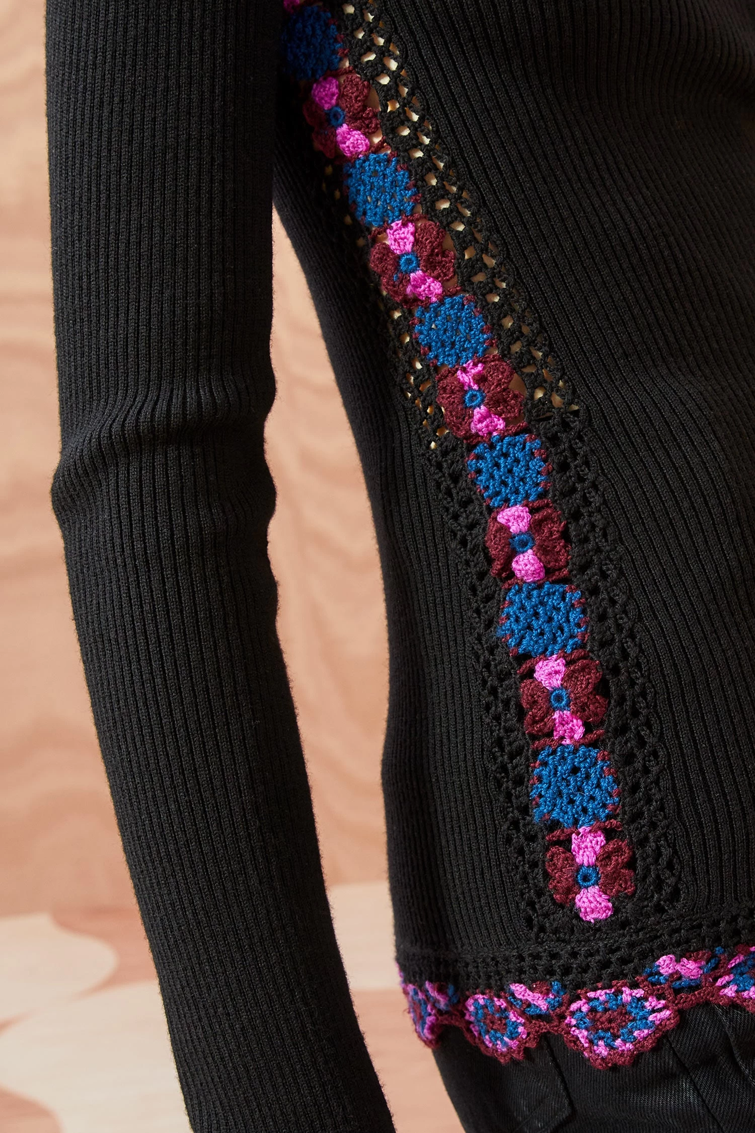 A timeless wardrobe essential, the Juniper Pullover is knitted from extrafine merino wool in a softly ribbed, body-skimming silhouette. This long-sleeve top features beautiful hand-crocheted floral trims with pops of blue, red, and pink. It is finished with gleaming mother-of-pearl buttons along the front.