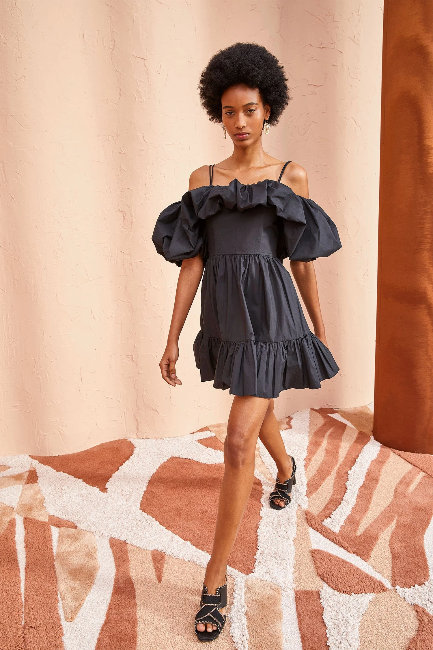 The Lila dress is cut in our signature cotton poplin in a classic black hue. This airy off-the-shoulder minidress features a corset-style bodice layered underneath a poufed ruffle that runs along each shoulder. It is finished with delicate, adjustable shoulder straps, pockets and a hidden side-seam zipper.