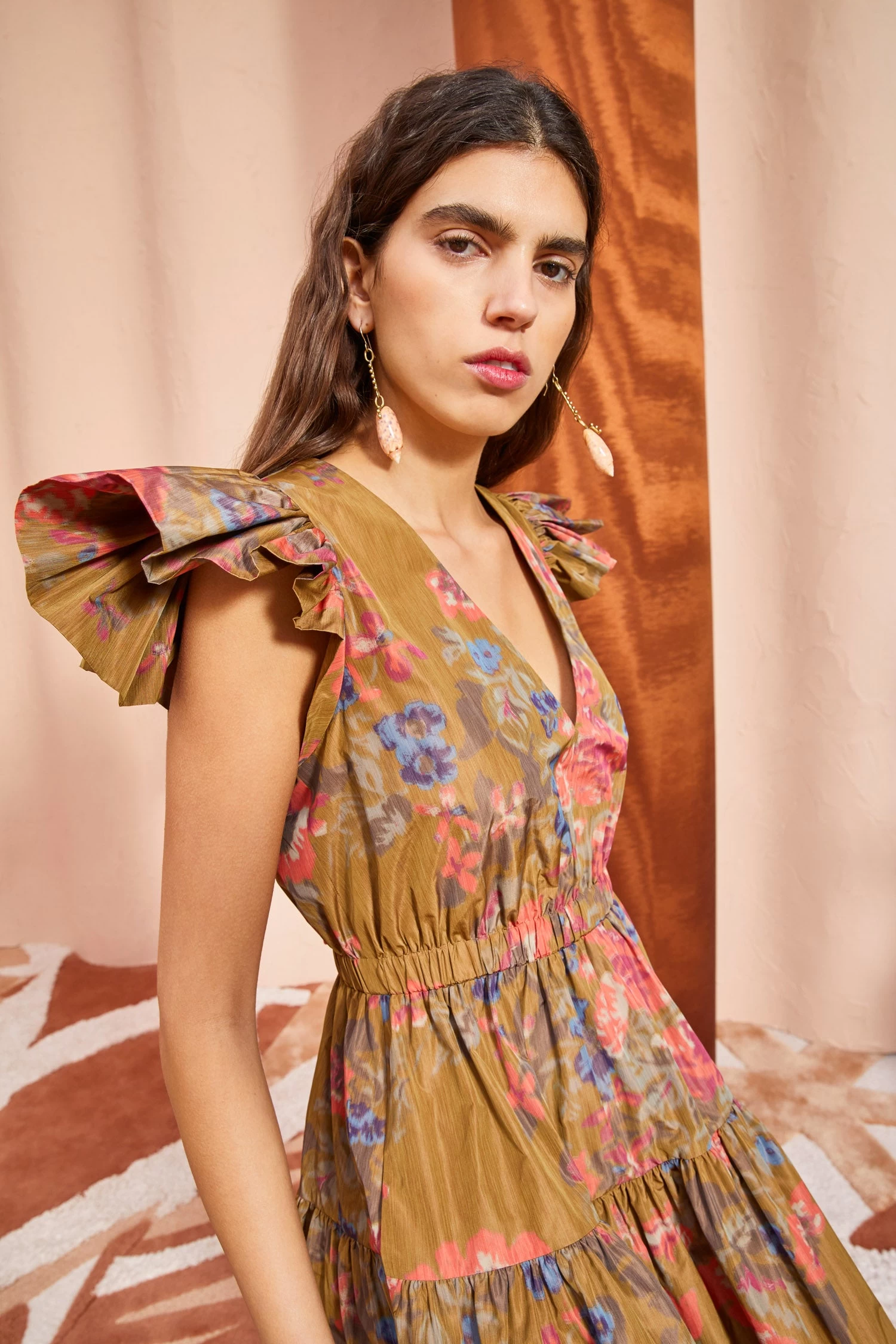 The Loretta Dress is cut from our warp printed floral taffeta, in light green, pale blue and soft pink hues. Yarns are printed before being woven together, producing a watercolor effect in which the print’s vibrant colors appear to melt into one another. This sweet mini dress features architectural ruffled short sleeves, a deep V-neckline and an elasticized waist. Finished with a side-seam zipper and pockets.
