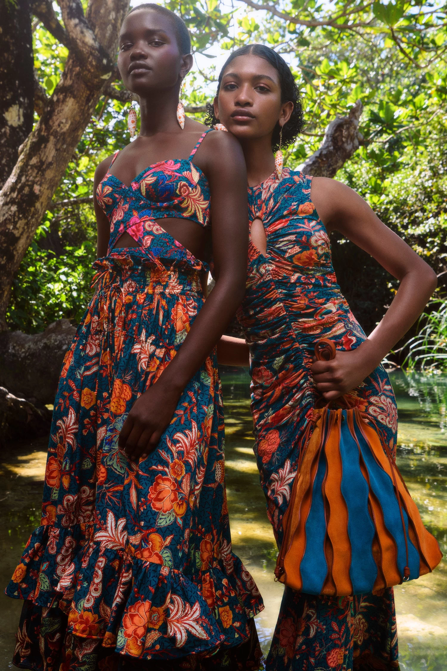 As featured in Look 28 of our Pre-Fall ’23 Lookbook, the Luna Maillot is our newest swim silhouette, made from a tropical-hued artwork that features red and pink florals against a teal background. This playful one-piece features underwire cups, criss-cross bodice with cutouts along the sides, and a full-coverage bottom.