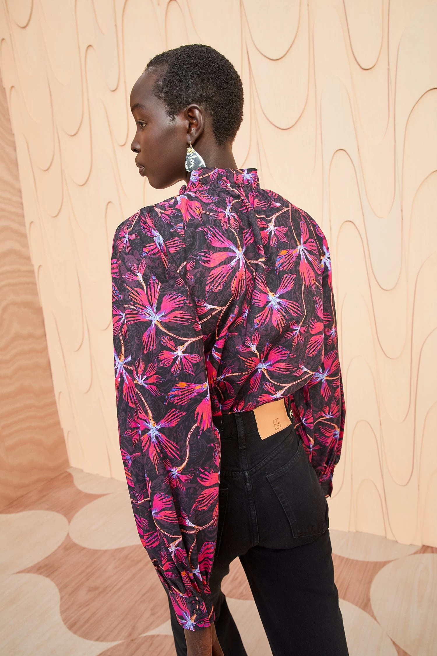 The Marlie Blouse is crafted from our moonflower printed poplin with hyper-saturated pigments of magenta and hyacinth set against a swirling black background. This elegant floral blouse features full long sleeves, buttoned cuffs, and delicate ruffles at the high neck.