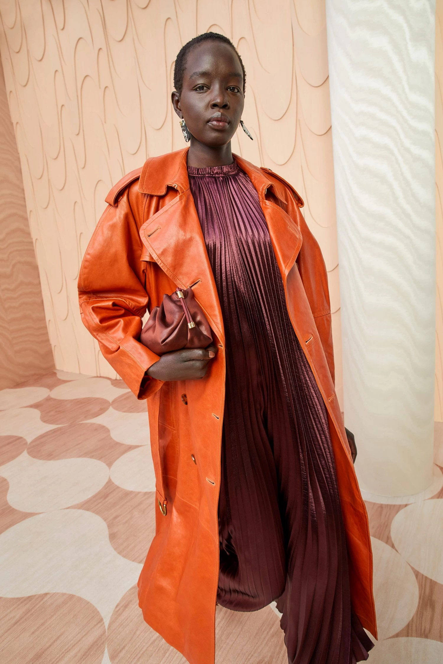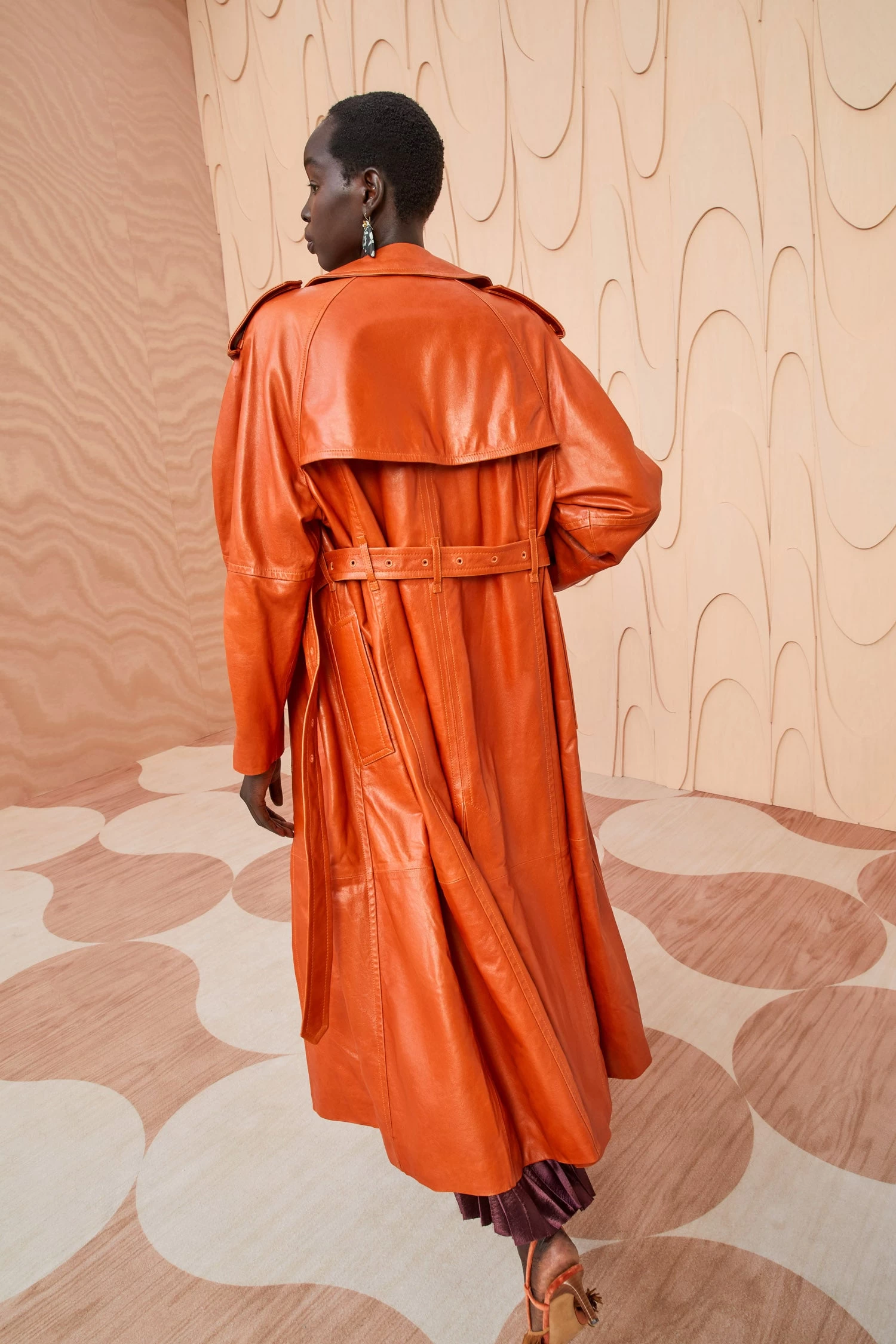 As featured in Look 5 of our Autumn/Winter ’23 Runway Show, the Marlowe Coat is made from a lustrous waxed leather with a slightly crackled surface texture. This gorgeous sierra brown trench coat features a nipped waist and classic utilitarian-style details.