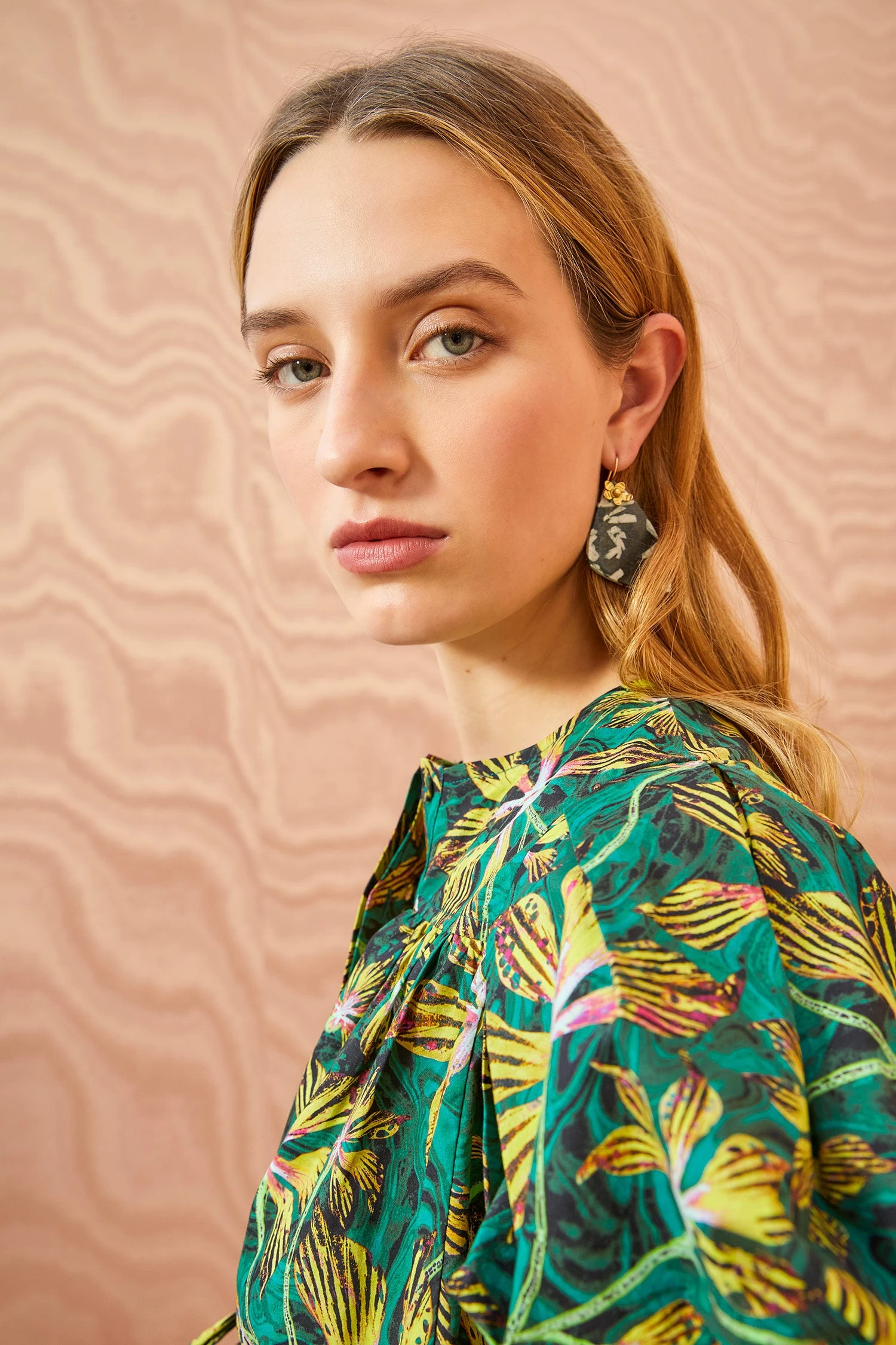The Mila Top is made from our moonflower printed poplin with ultra-vibrant hues of emerald green and pink. This gorgeous short-sleeve top boasts signature puff sleeves and a drawstring waist that creates a lovely peplum hem. It is finished with concealed button-front closures.