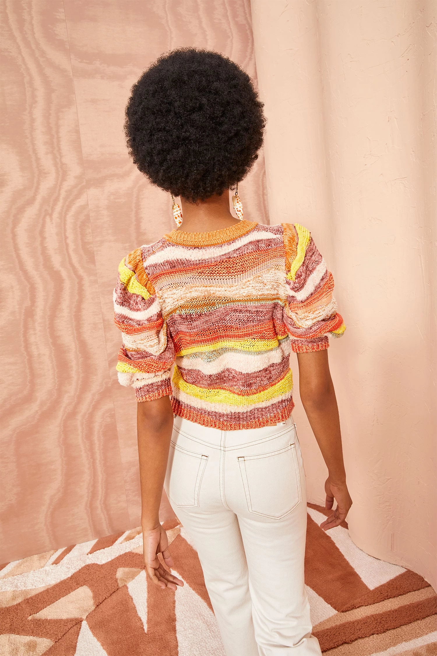 The Odie Top is a cropped, puff-sleeved knit made with our prismatic wave cotton drop-stitch, featuring painterly stripes in contrasting red, yellow and crimson hues. This short-sleeved top is defined by its banded collar, sleeves, and hemline.