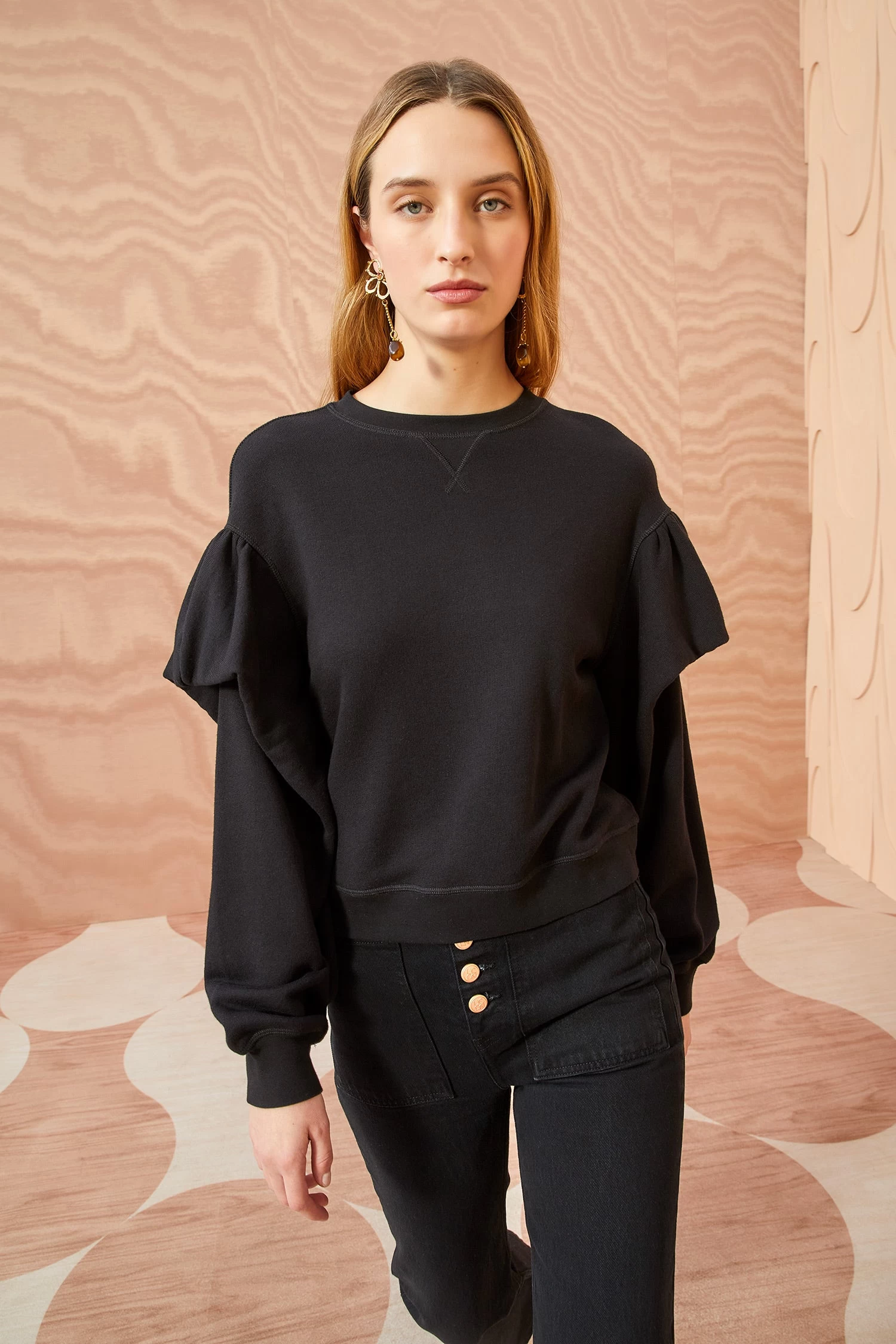 Equally elegant and effortless, the Pilar Pullover is crafted from our ultra-soft fleece made with bamboo and organic cotton and is a classic black hue. This long-sleeve crewneck style features statement puff sleeves and is the perfect companion to our handmade denim.