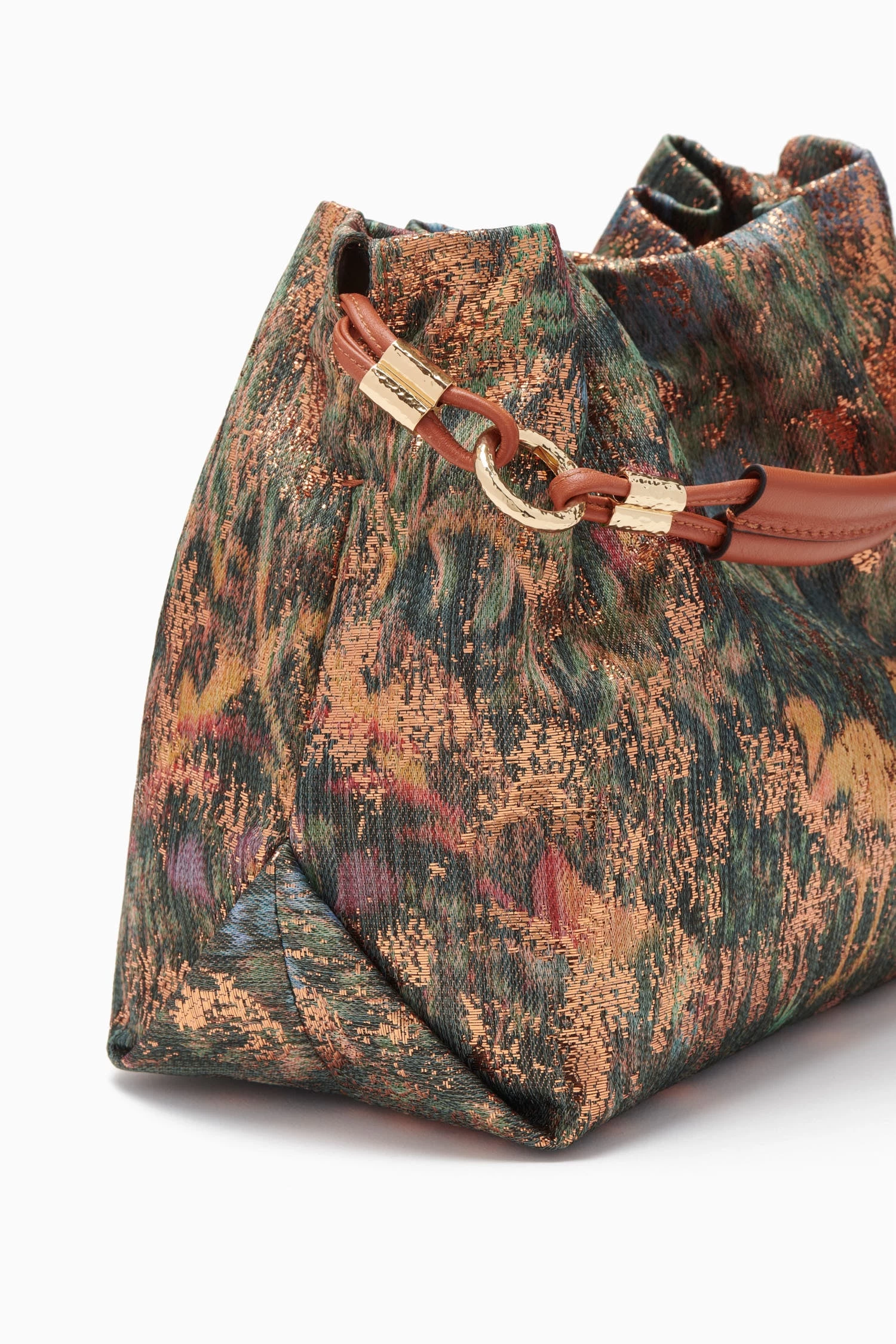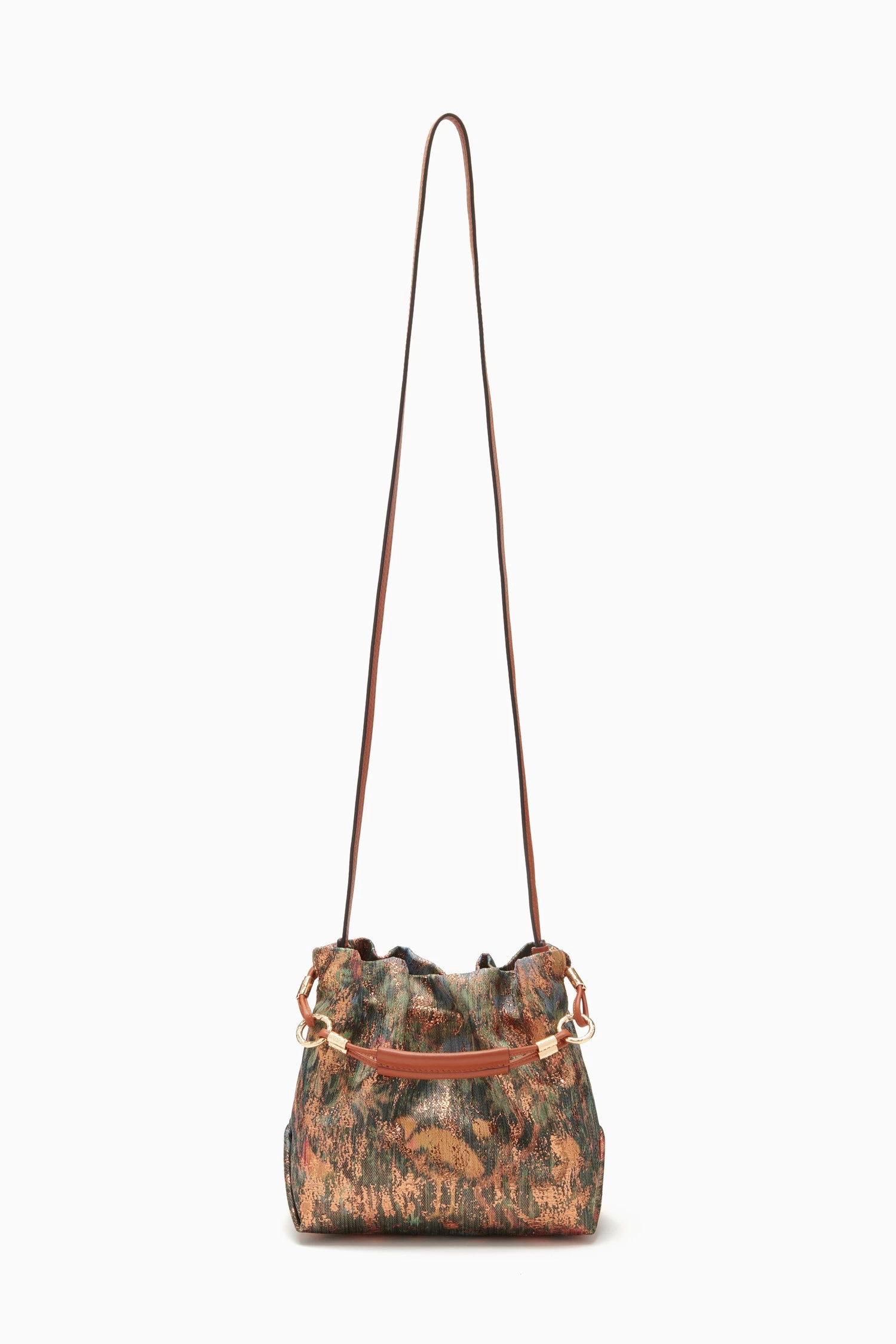 The Remy Mini Handbag is crafted in Italy from a soft lurex jacquard, featuring a woodland-inspired pattern enhanced with metallic threads. This iconic bag can be worn as a crossbody when styled with the long strap, or as a hand-held mini with the short handle. This silhouette is softly gathered at the top opening when the drawstring is pulled tight at the sides. It has an interior magnet closure and an interior zipper pocket.