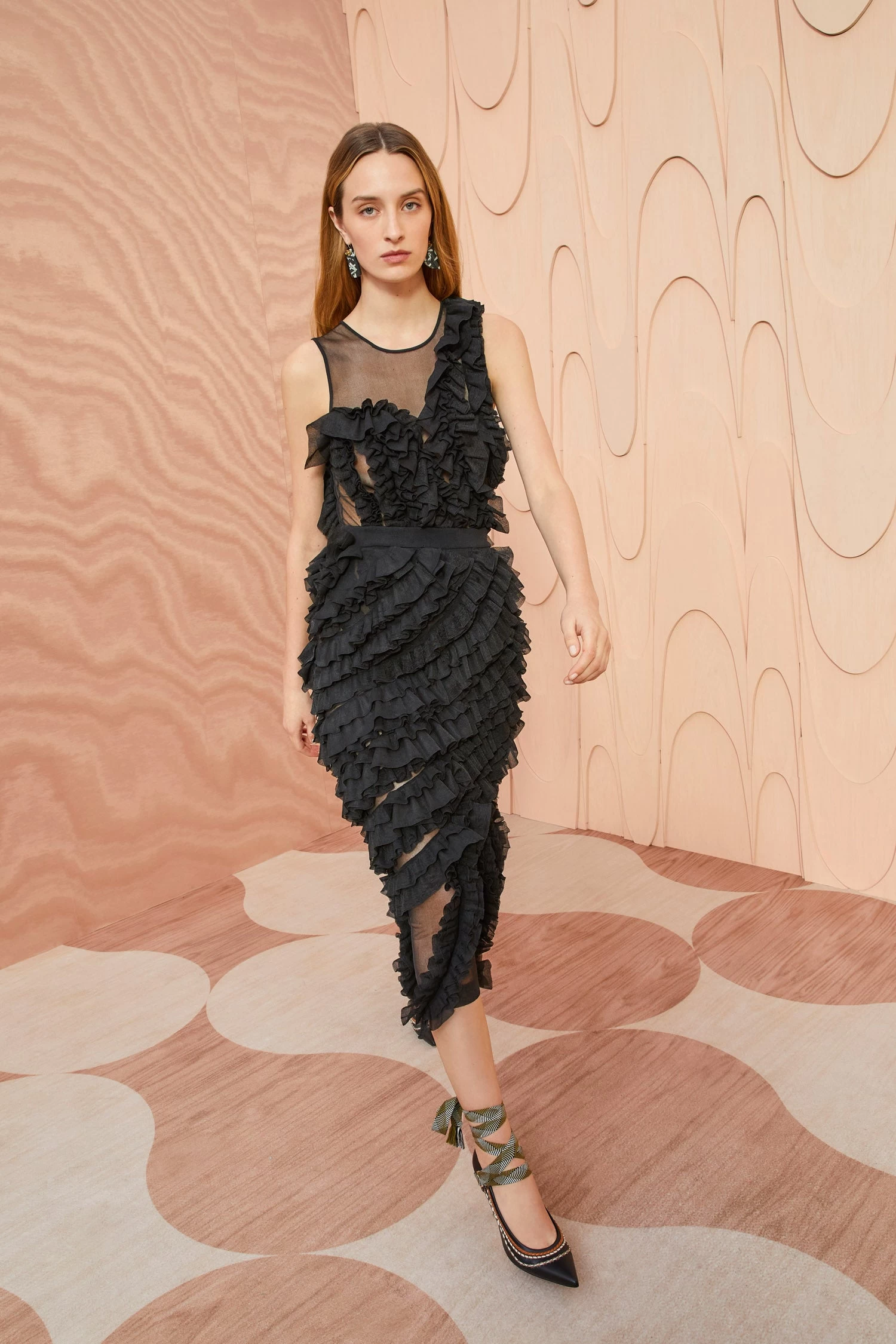 As featured in Look 17 of our Autumn/Winter ’23 Runway Show, the Sarafina Skirt is made from sheer black mesh adorned with an explosion of fluttering frills across its length that move in an asymmetric pattern. This midi-length skirt has a side split for ease of movement and an elastic waistband.