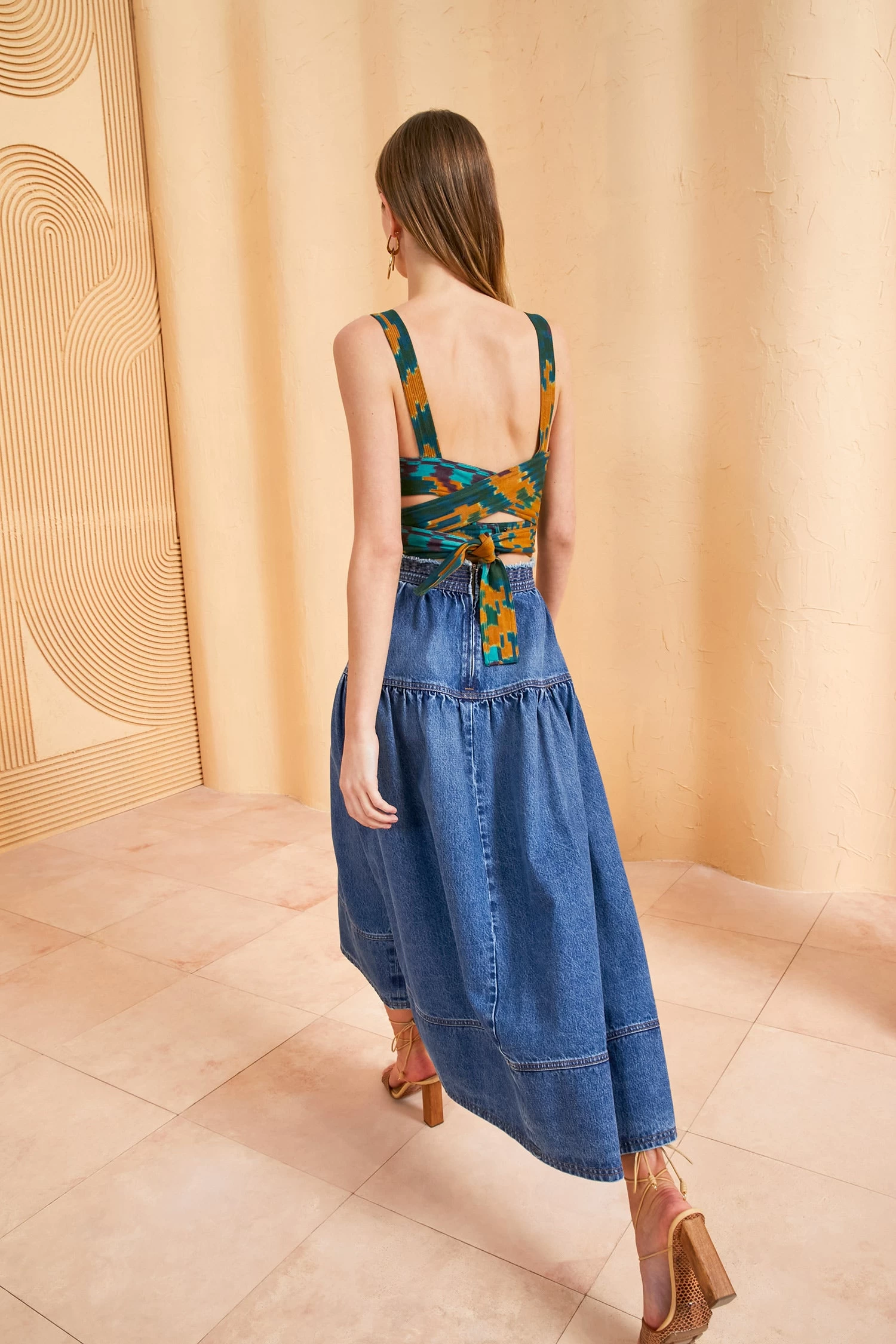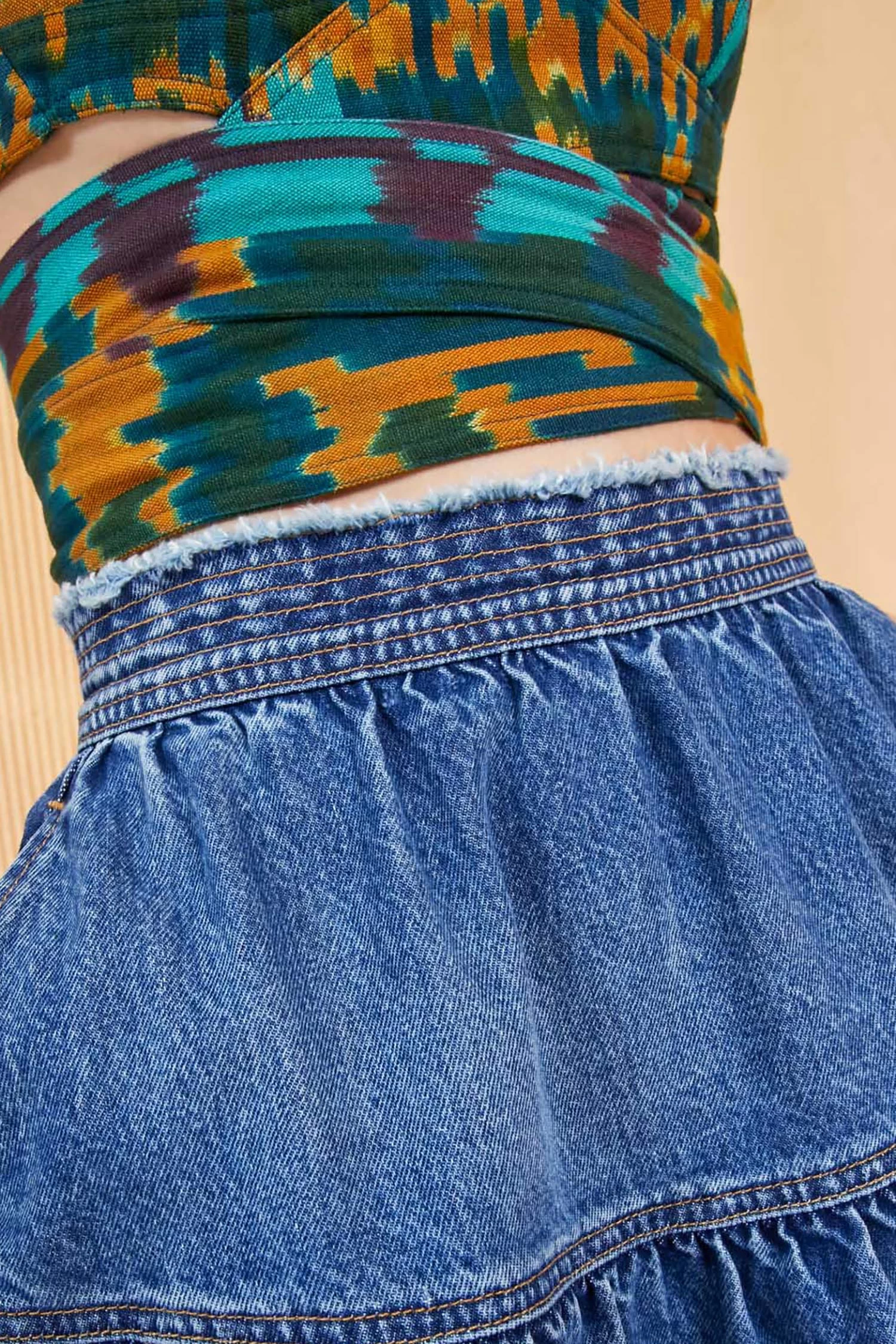As featured in Look 19 of our Spring/Summer ’23 Runway Show, the Astrid Skirt is the newest addition to our denim collection. Dyed in a medium indigo wash, this A-line skirt has a fitted waist and gathered tier. It is finished with a fixed waistband detailed with a raw edge. All our premium denim is responsibly handmade in Los Angeles using high-quality materials.