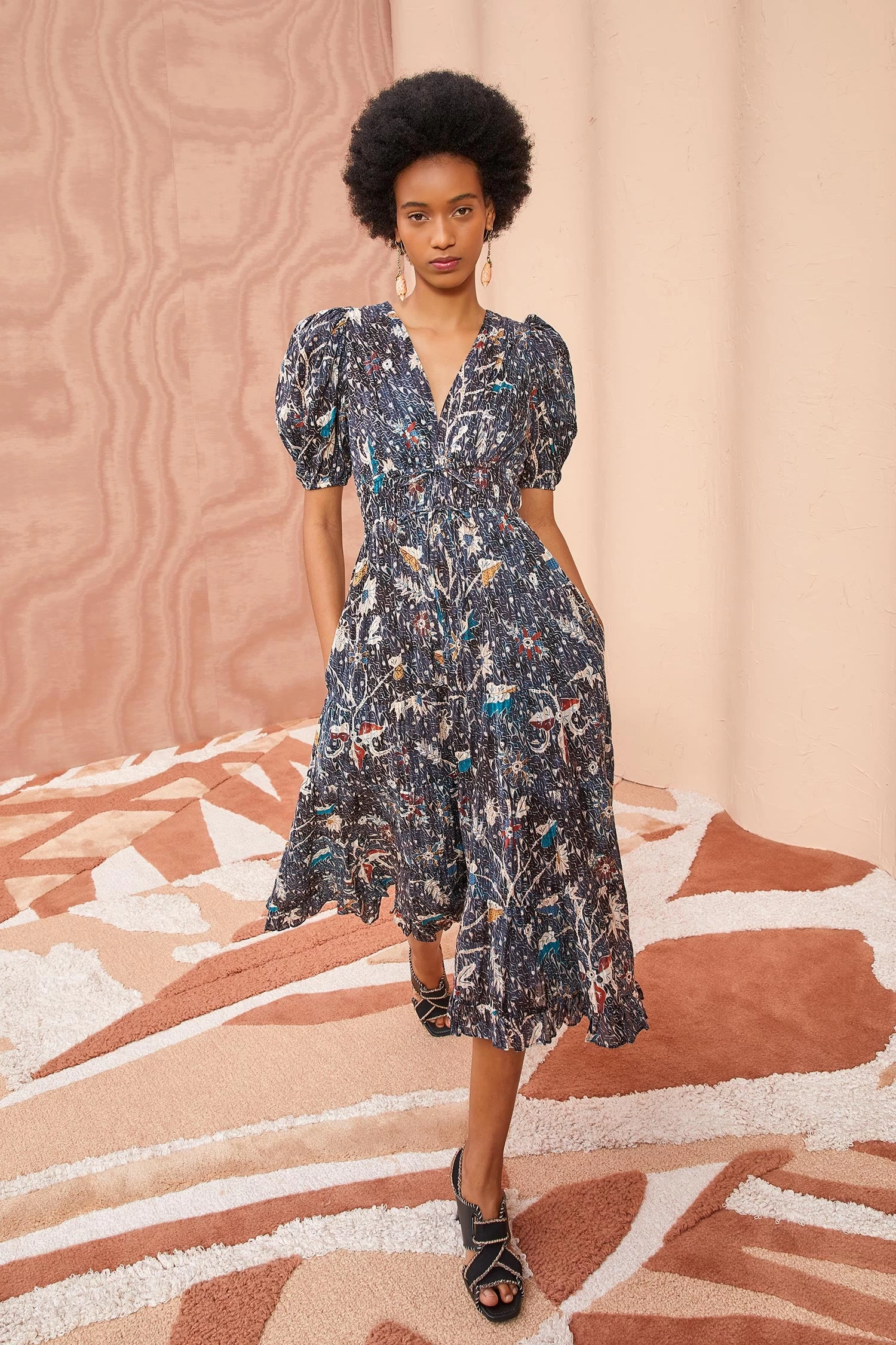 The Thelma Dress is an effortless silhouette crafted in our signature shadow stripe cotton. This graphic midi dress features a blue and grey batik-inspired print, and is defined by puff sleeves, and a ruched bodice with two drawstring ties at the fitted waist. Finished with side-seam pockets.