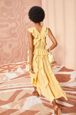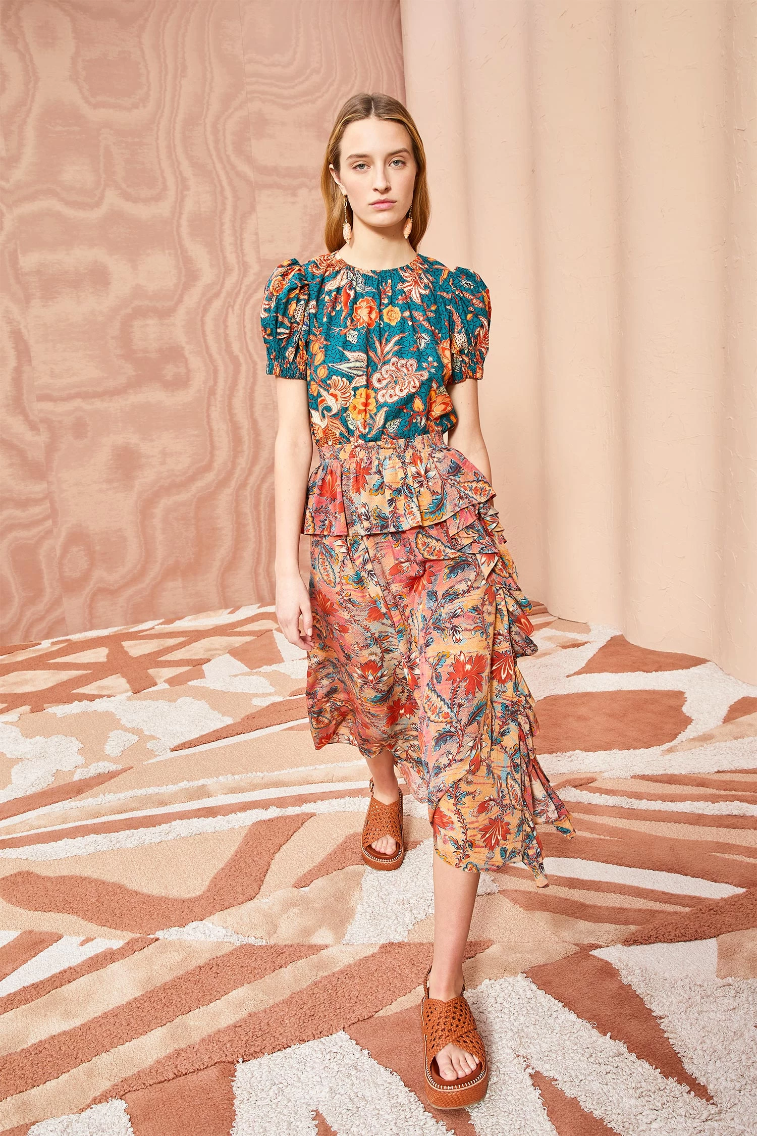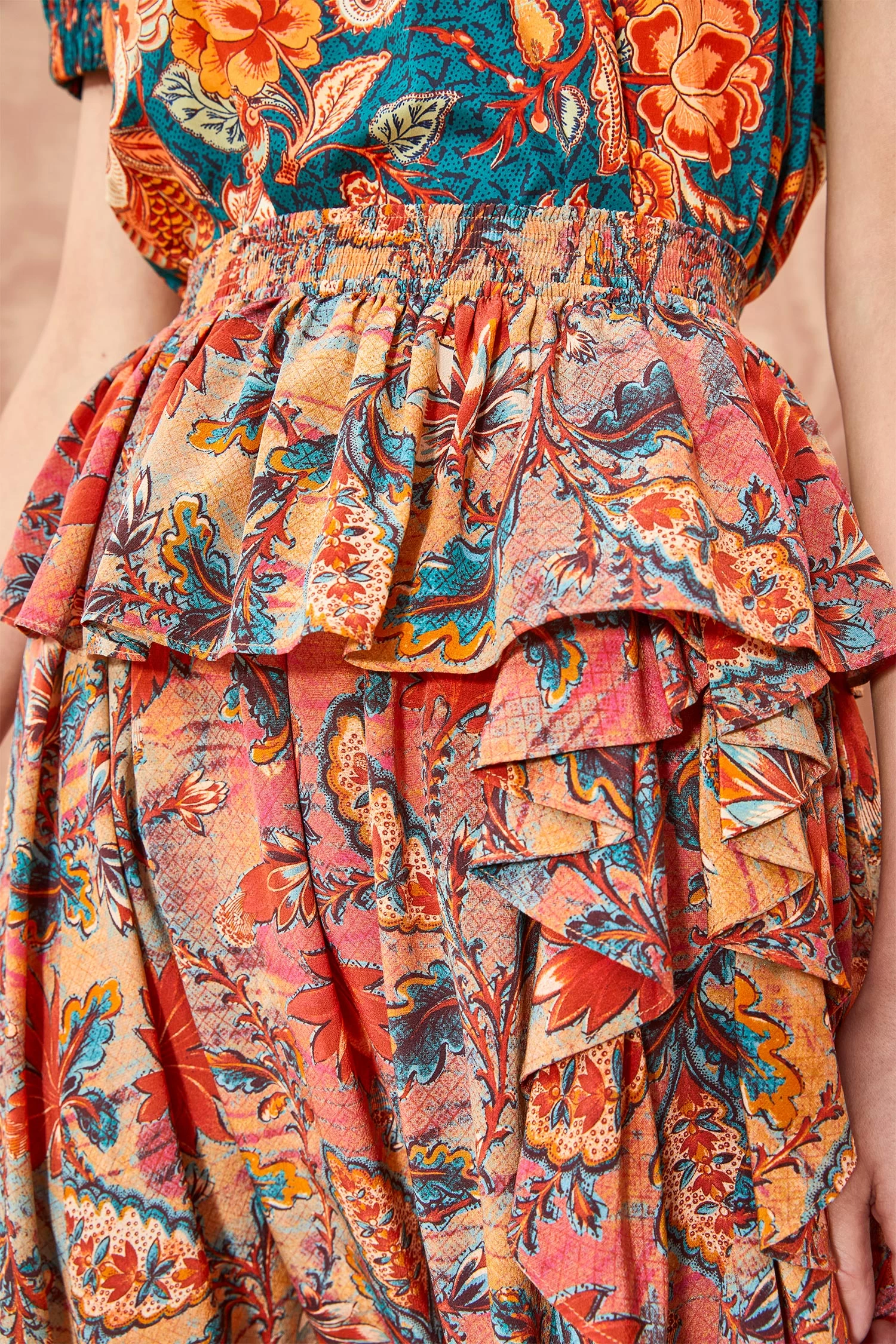As featured in Look 5 of our Pre-Fall ’23 Lookbook, the Ursa Skirt is a romantic silhouette crafted from our blooming paisley crepe de chine, a lightweight silk adorned with cascading ruffles and gathered seams. This orange, red and blue floral skirt features a fixed waist, peplum hem, and a side slit framed by a ruffle that falls to the hemline.