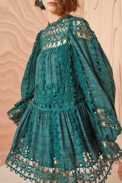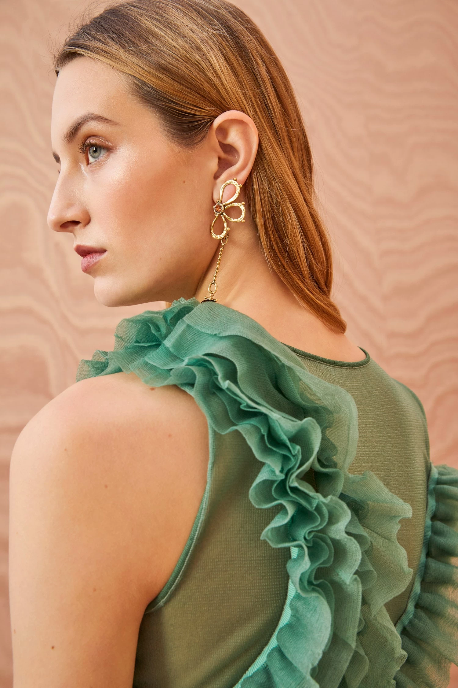 As featured in Look 2 of our Autumn/Winter ’23 Runway Show, our Winnifred Top is a joyous explosion of ruffles–a translucent knit is transformed into a sheer silhouette, while delicate frills are applied on top. This sleeveless top has a crewneck and is a delightful jade green.