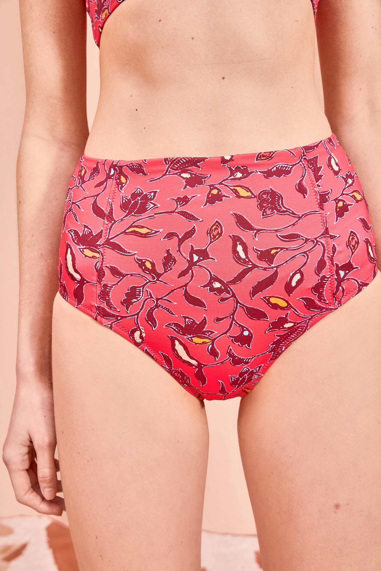 The Zahara Bikini Bottom is a high-waisted silhouette featuring flattering princess seams. Cut in a fuchsia floral print, this style pairs perfectly with the Zahara Bikini Top in Poppy.